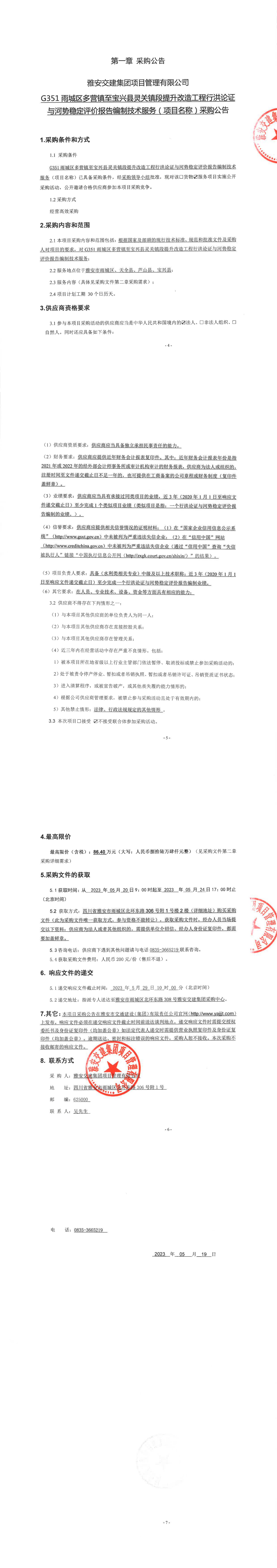 雅安交建集團(tuán)項(xiàng)目管理有限公司G351雨城區(qū)多營鎮(zhèn)至寶興縣靈關(guān)鎮(zhèn)段提升改造工程行洪論證與河勢穩(wěn)定評(píng)價(jià)報(bào)告編制技術(shù)服務(wù)(項(xiàng)目名稱)采購公告