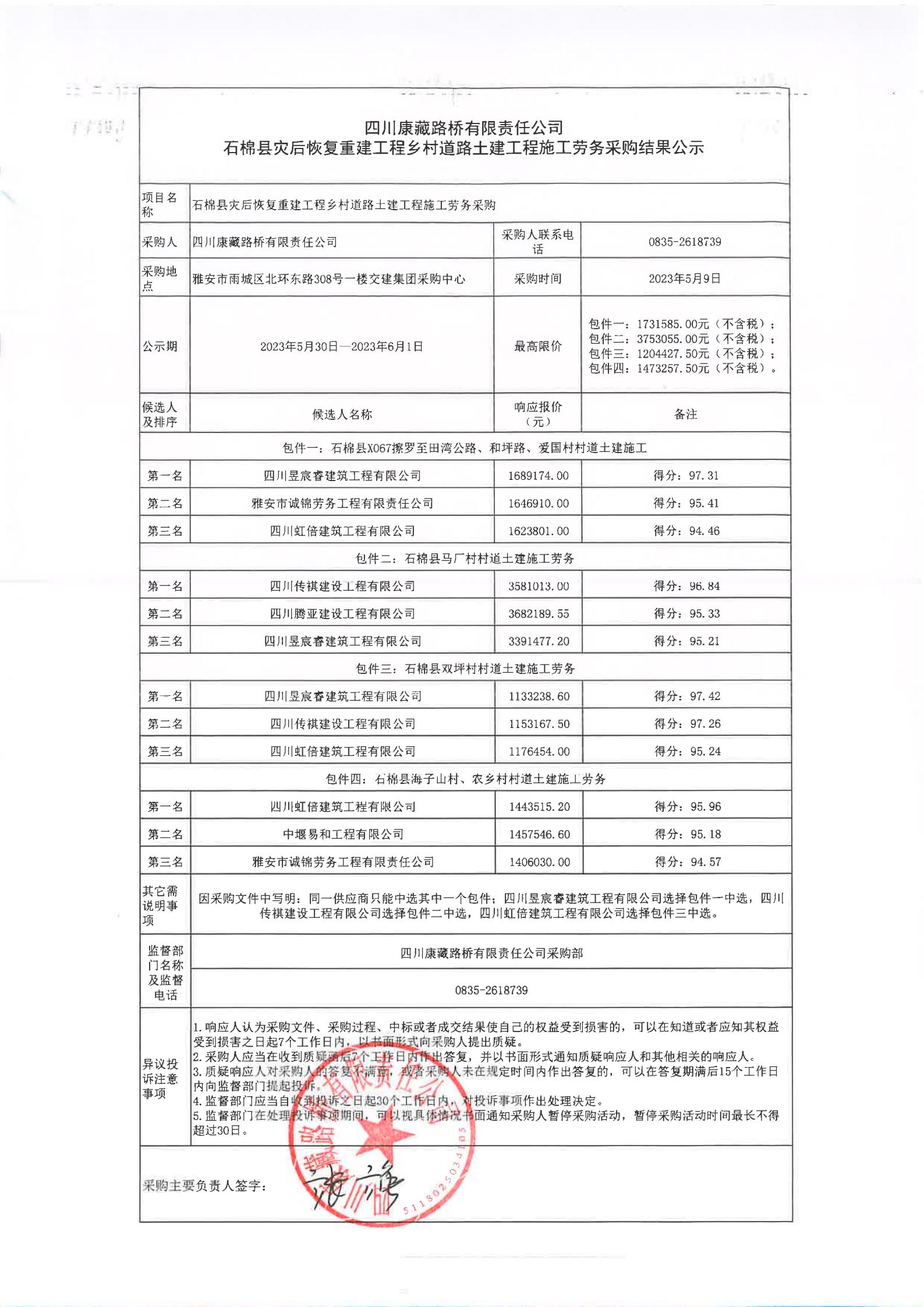 四川康藏路橋有限責任公司石棉縣災(zāi)后恢復(fù)重建工程鄉(xiāng)村道路土建工程施工勞務(wù)采購結(jié)果公示