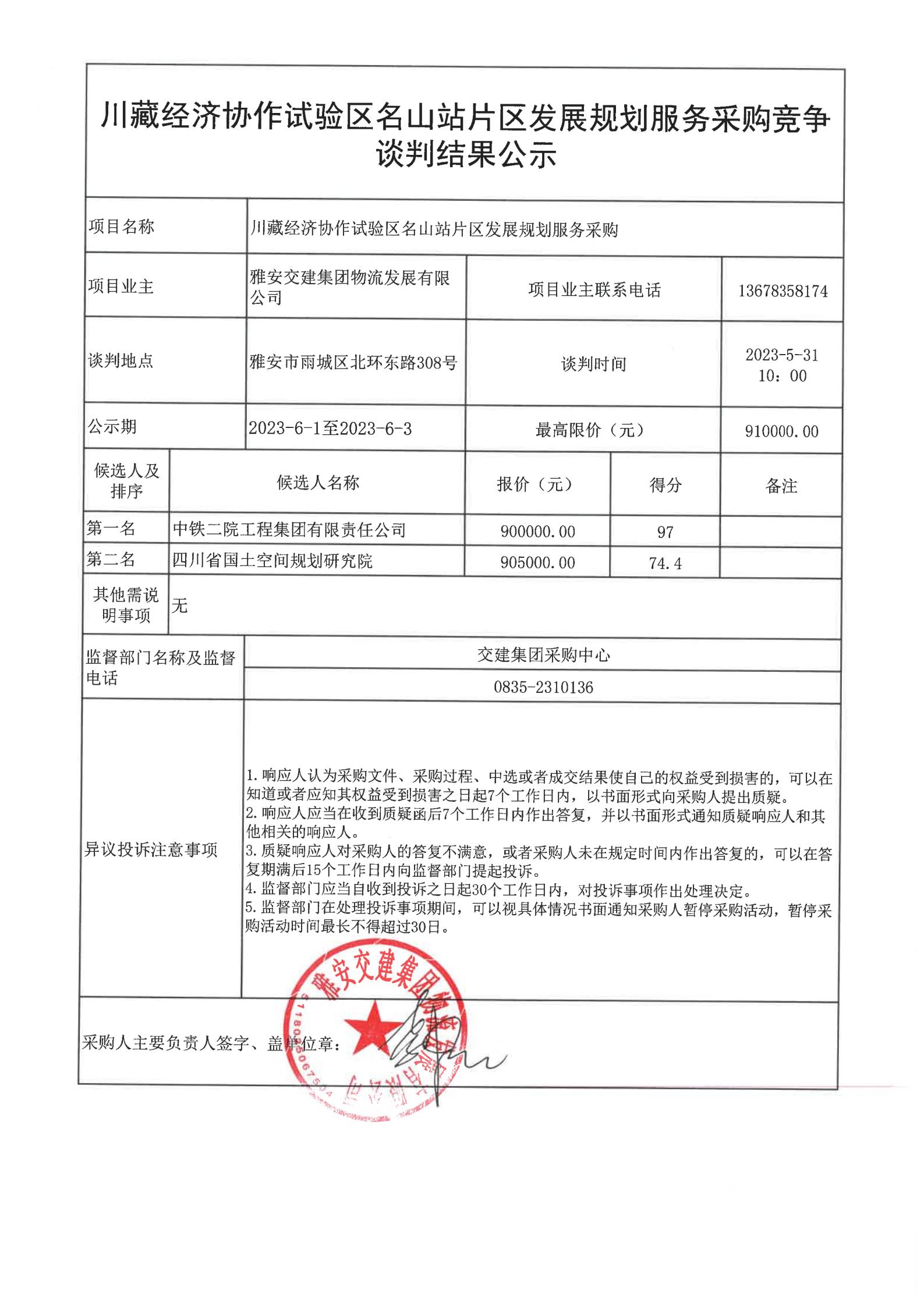 雅安交建集團物流發(fā)展有限公司川藏經(jīng)濟協(xié)作試驗區(qū)名山站片區(qū)發(fā)展規(guī)劃編制服務采購競爭談判結果公示