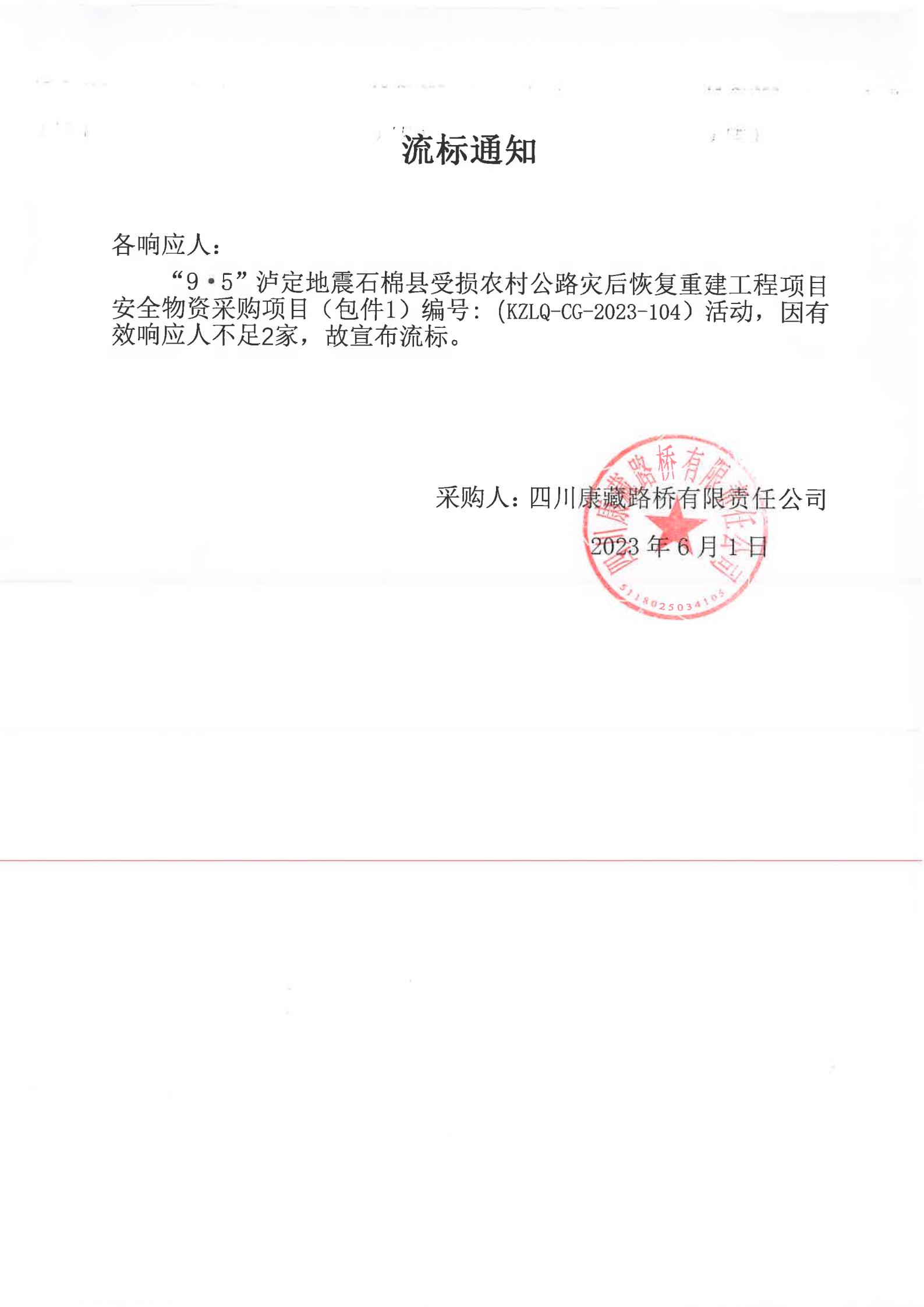 四川康藏路橋有限責(zé)任公司“9·5”瀘定地震石棉縣受損農(nóng)村公路災(zāi)后恢復(fù)重建工程項(xiàng)目安全物資項(xiàng)目(包件1)流標(biāo)通知