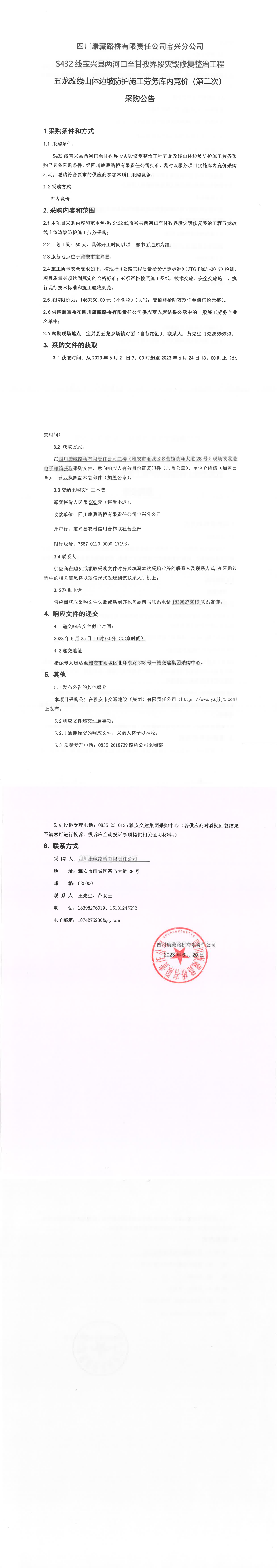 四川康藏路橋有限責(zé)任公司寶興分公司S432線寶興縣兩河口至甘孜界段災(zāi)毀修復(fù)整治工程五龍改線山體邊坡防護(hù)施工勞務(wù)庫內(nèi)競價(jià)(第二次)采購公告