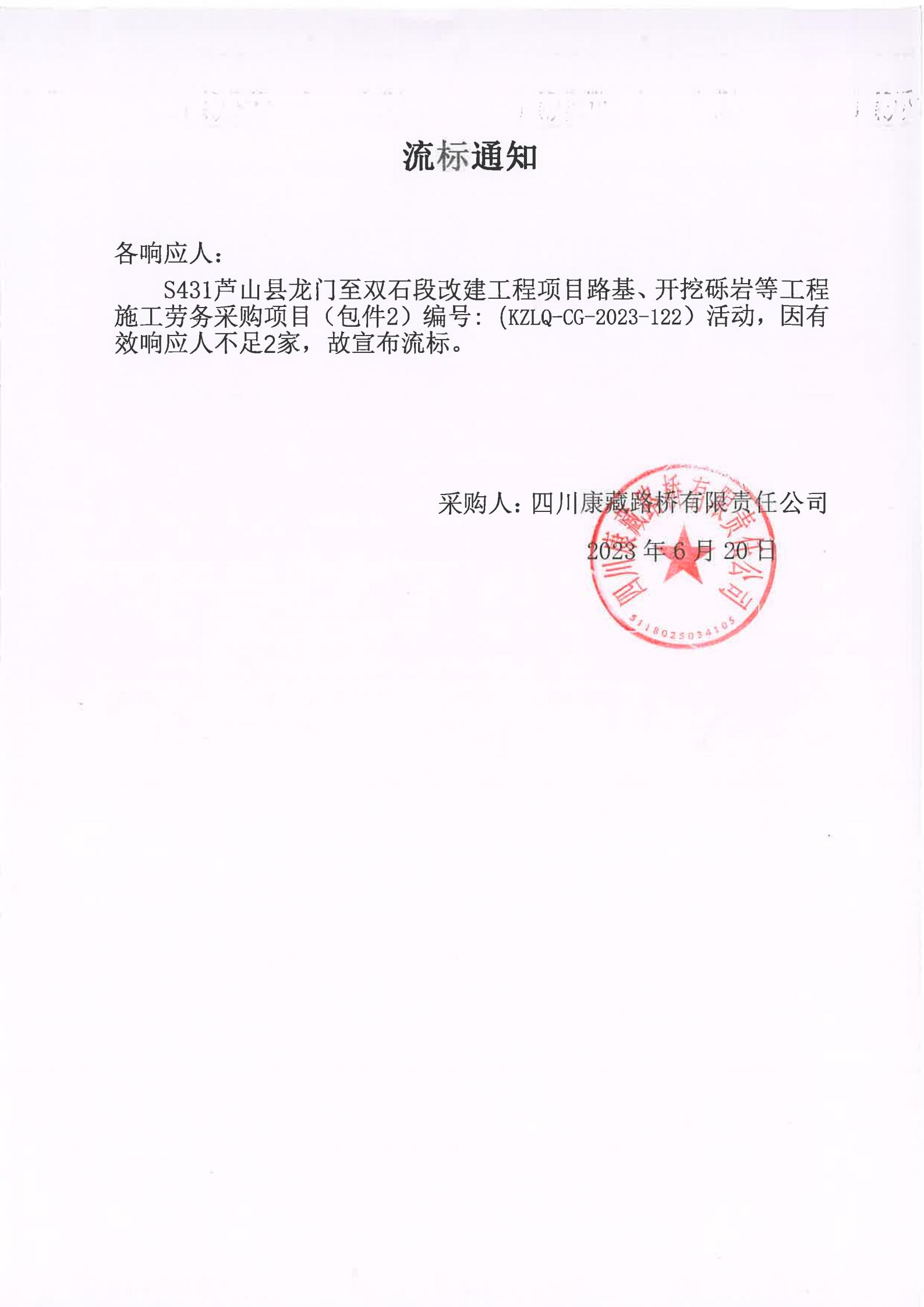 四川康藏路橋有限責任公司S431蘆山縣龍門至雙石段改建工程項目路基、開挖礫巖等工程施工勞務采購(包件2)流標通知