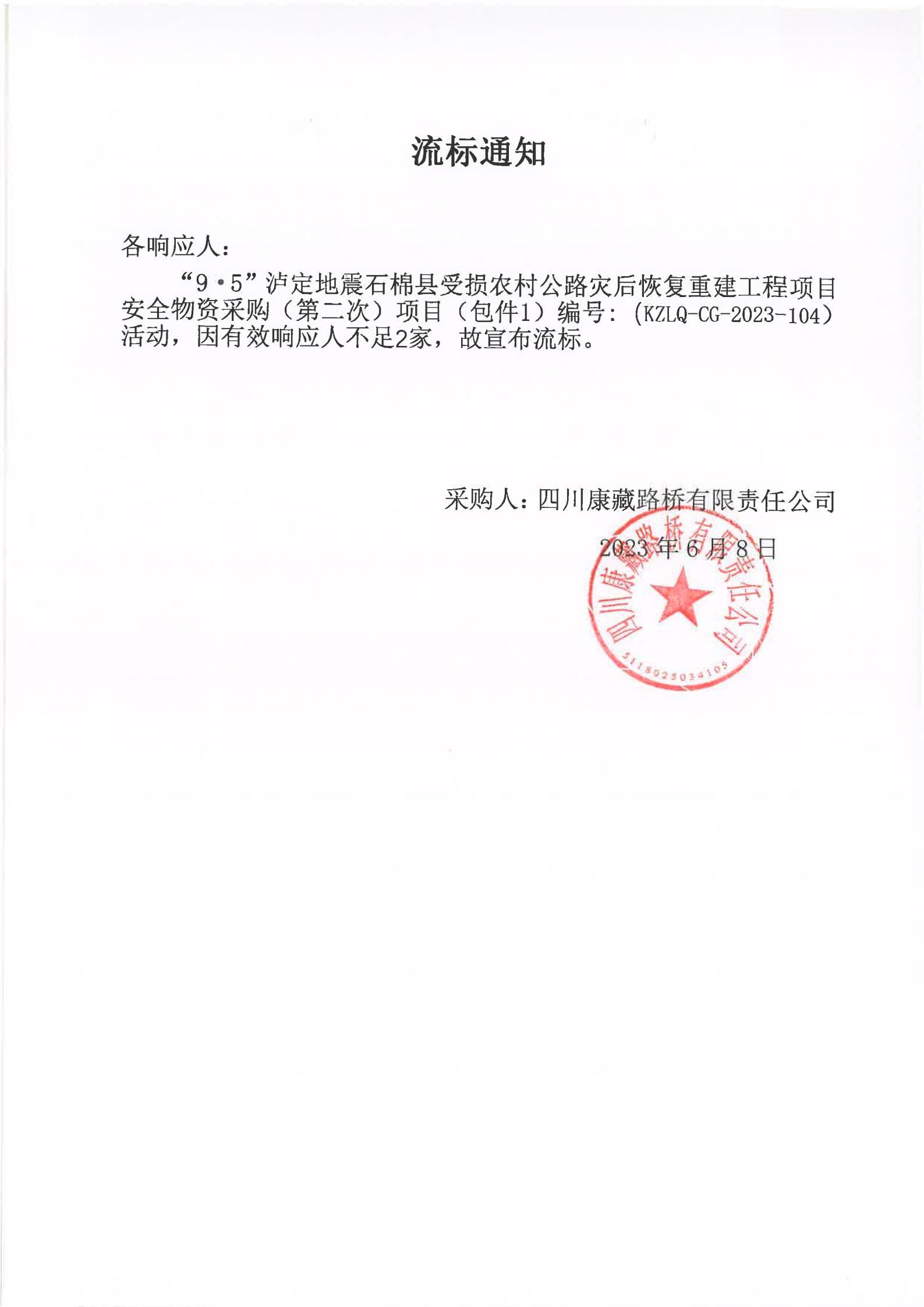 四川康藏路橋有限責(zé)任公司“9·5”瀘定地震石棉縣受損農(nóng)村公路災(zāi)后恢復(fù)重建工程項目安全物資競價采購(第二次)流標(biāo)通知