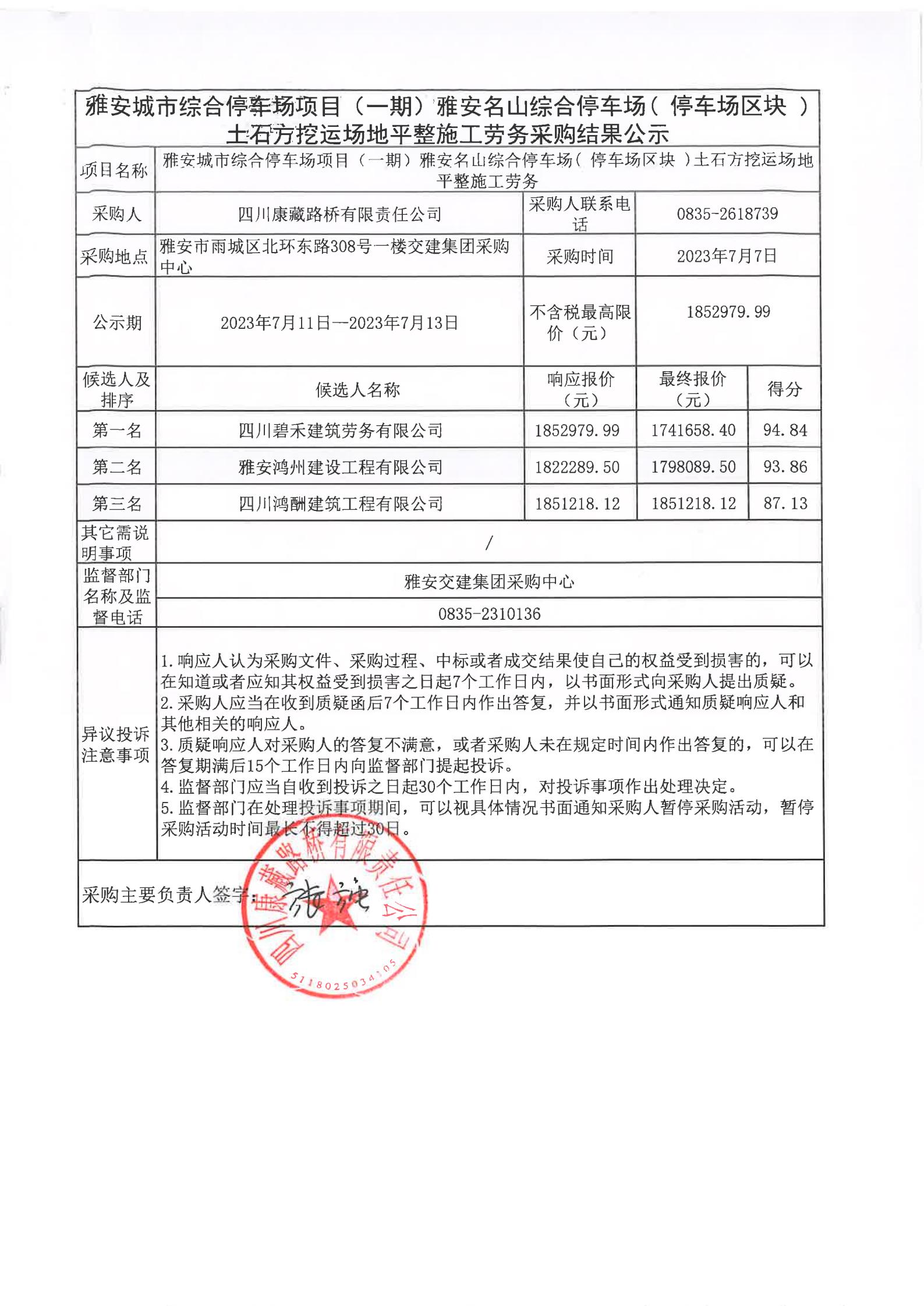 四川康藏路橋有限責(zé)任公司雅安城市綜合停車場項(xiàng)目(一期)雅安名山綜合停車場(停車場區(qū)塊)土石方挖運(yùn)場地平整施工勞務(wù)采購結(jié)果公示