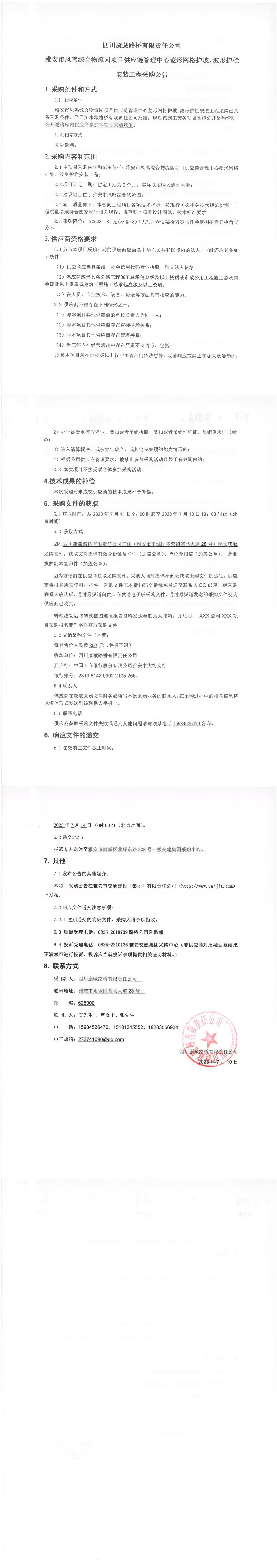 四川康藏路橋有限責(zé)任公司雅安市鳳鳴綜合物流園項(xiàng)目供應(yīng)鏈管理中心菱形網(wǎng)格護(hù)坡、波形護(hù)欄安裝工程采購公告