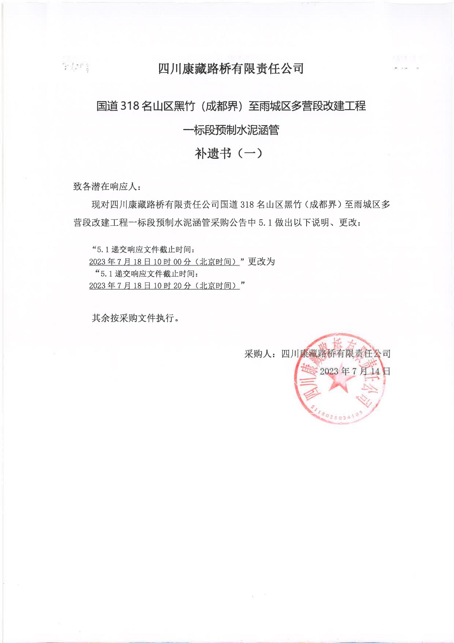 四川康藏路橋有限責任公司國道318名山區(qū)黑竹(成都界)至雨城區(qū)多營段改建工程一標段預制水泥涵管(補遺書)(一)