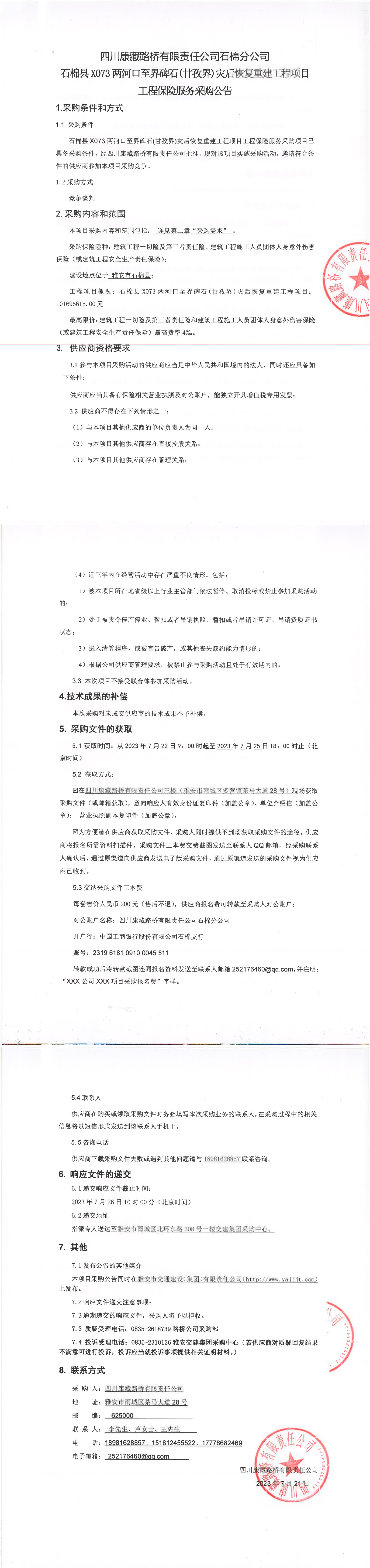 四川康藏路橋有限責(zé)任公司石棉縣X073兩河口至界碑石(甘孜界)災(zāi)后恢復(fù)重建工程項(xiàng)目工程保險服務(wù)采購公告