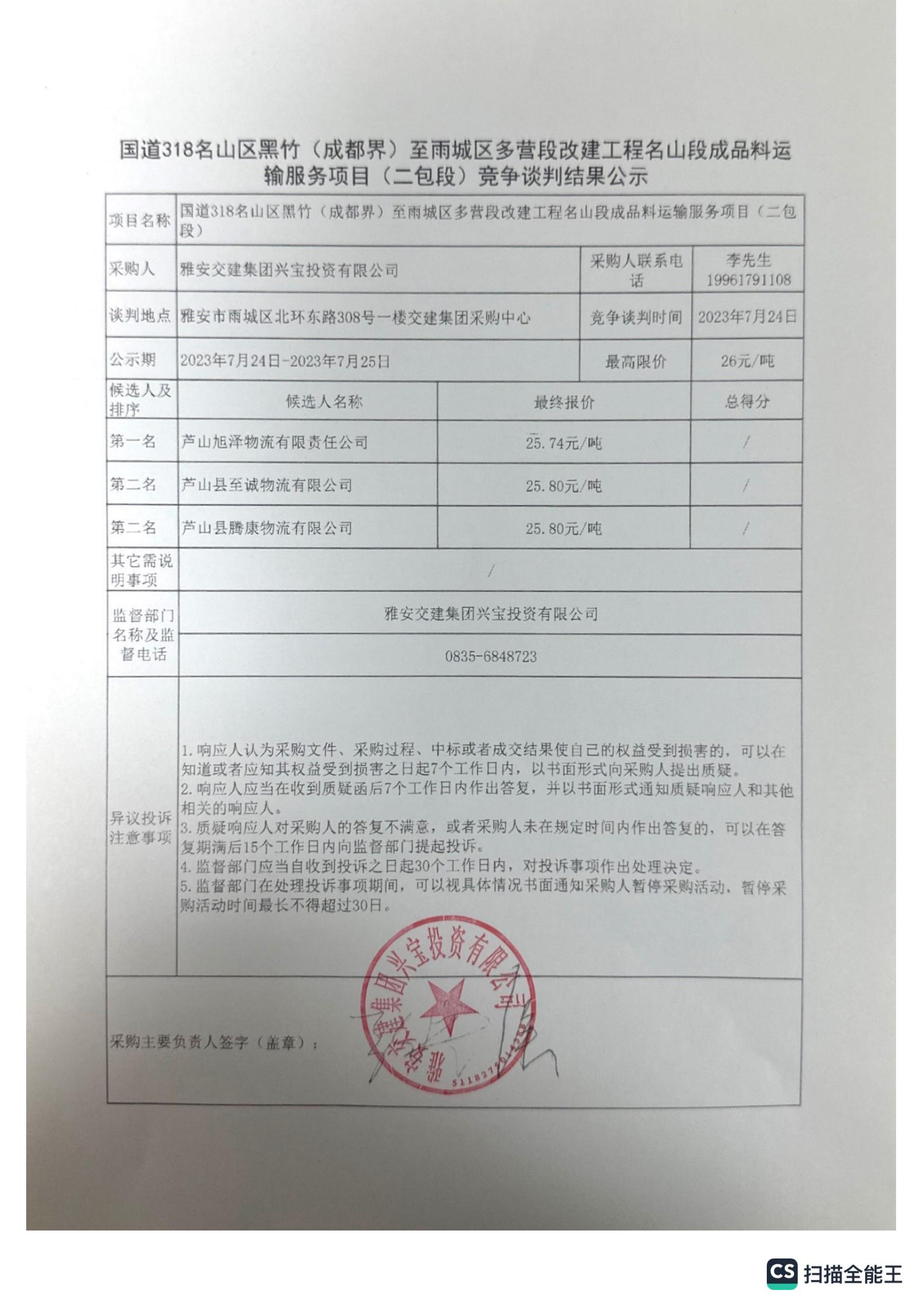 雅安交建集團(tuán)興寶投資有限公司國道318名山區(qū)黑竹(成都界)至雨城區(qū)多營段改建工程名山段成品料運(yùn)輸服務(wù)項(xiàng)目(一包段)競(jìng)爭(zhēng)談判結(jié)果公示
