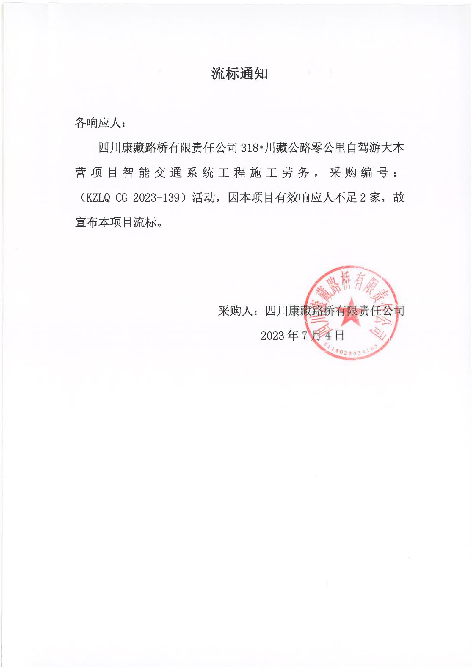 四川康藏路橋有限責(zé)任公司318·川藏公路零公里自駕游大本營項目智能交通系統(tǒng)工程施工勞務(wù)流標(biāo)通知