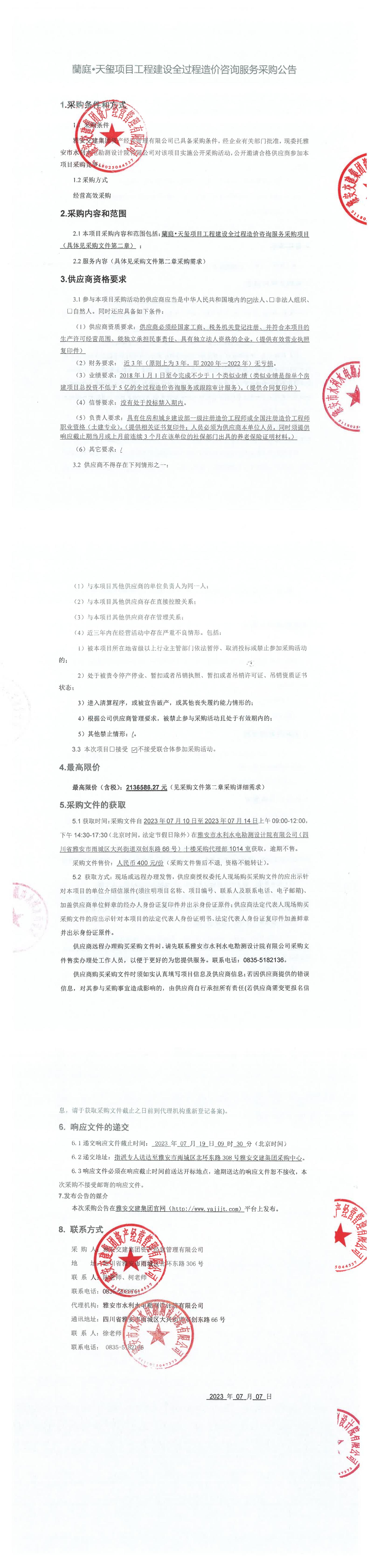 雅安交建集團(tuán)資產(chǎn)經(jīng)營管理有限公司蘭庭•天璽項目工程建設(shè)全過程造價咨詢服務(wù)采購公告