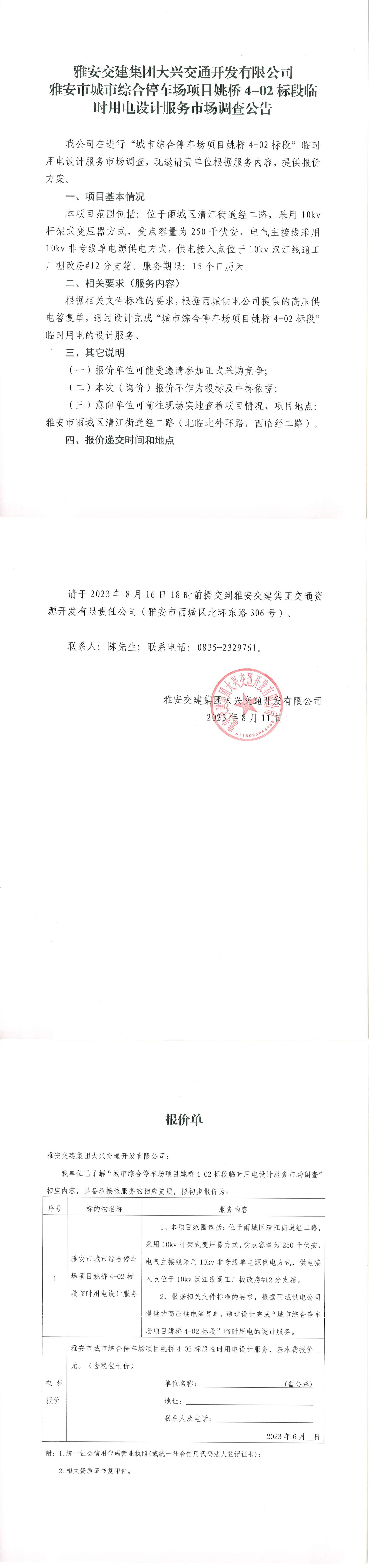 雅安交建集團(tuán)大興交通開(kāi)發(fā)有限公司雅安市城市綜合停車(chē)場(chǎng)項(xiàng)目姚橋4-02標(biāo)段臨時(shí)用電設(shè)計(jì)服務(wù)市場(chǎng)調(diào)查公告