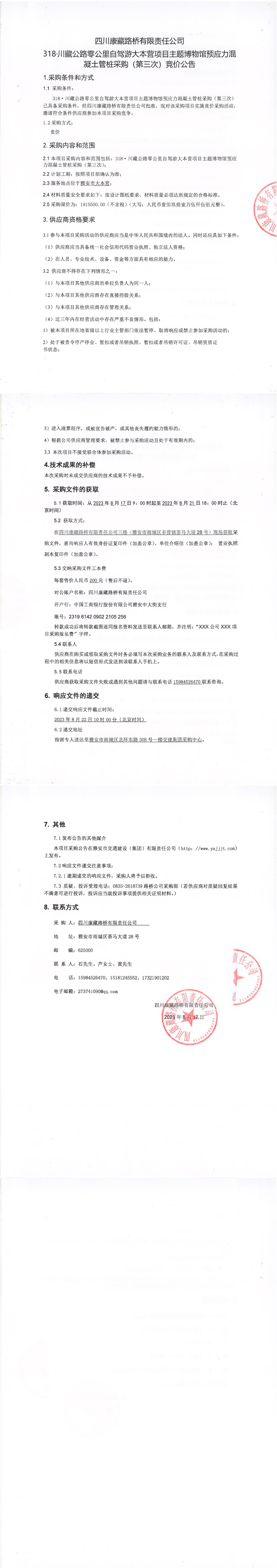 四川康藏路橋有限責任公司318·川藏公路零公里自駕游大本營項目主題博物館預應力混凝土管樁采購(第三次)競價公告