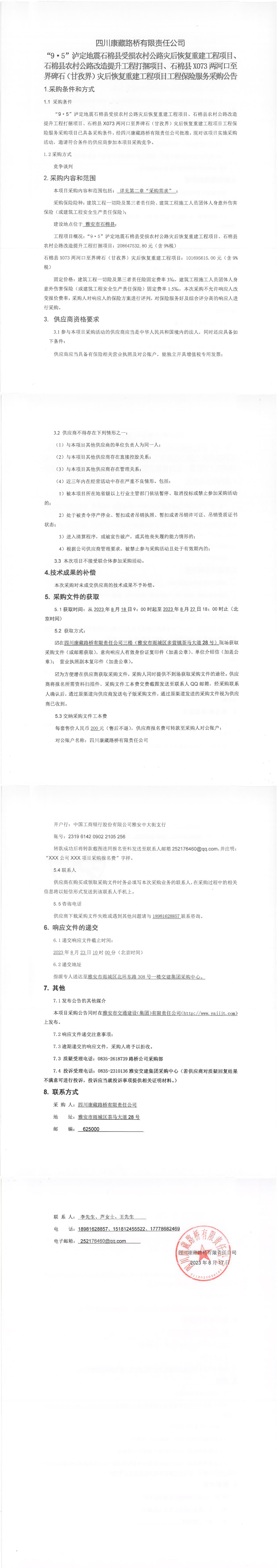 四川康藏路橋有限責(zé)任公司“9·5”瀘定地震石棉縣受損農(nóng)村公路災(zāi)后恢復(fù)重建工程項目、石棉縣農(nóng)村公路改造提升工程打捆項目、石棉縣X073兩河口至界碑石(甘孜界)災(zāi)后恢復(fù)重建工程項目工程保險服務(wù)采購公告