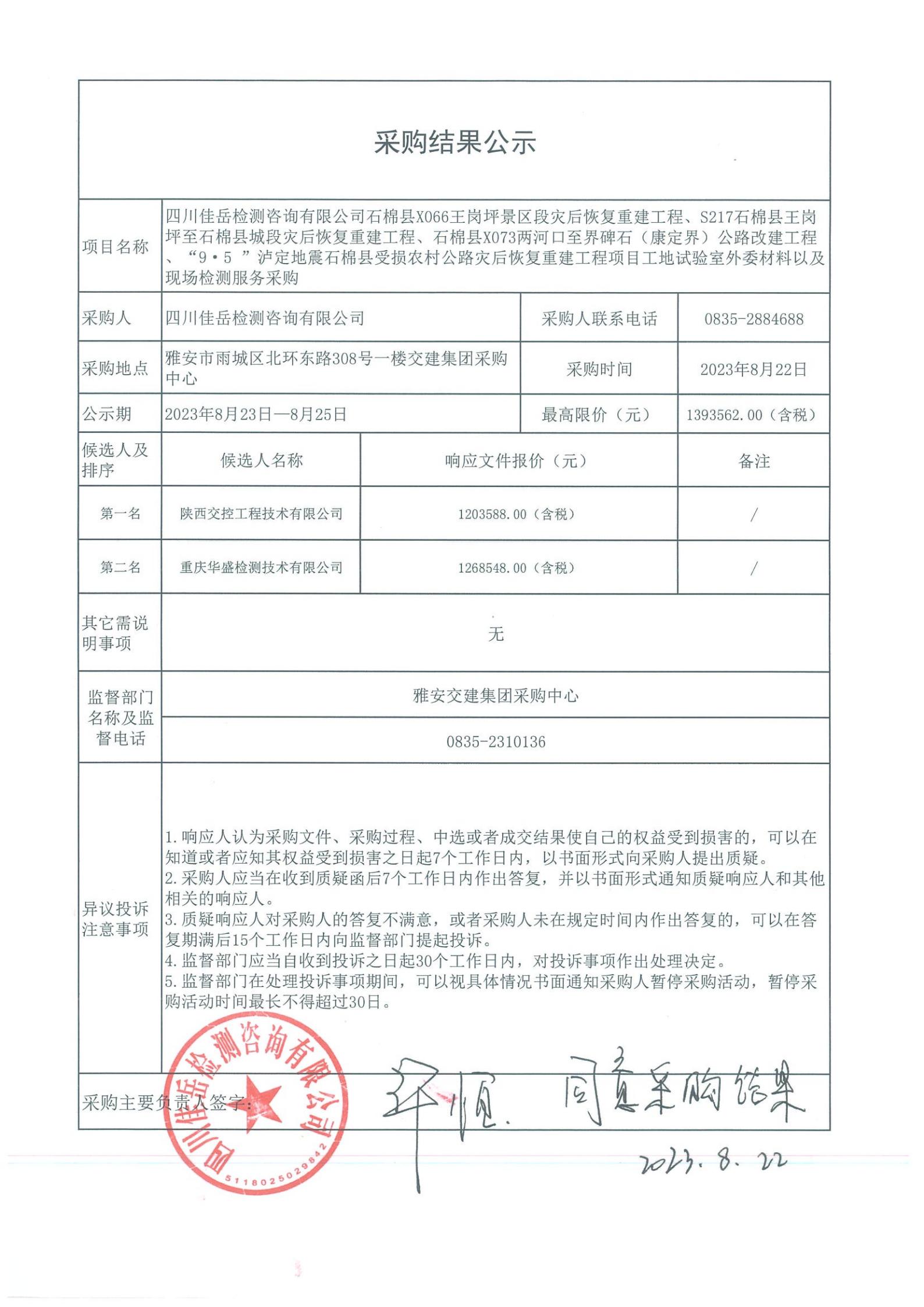 四川佳岳檢測咨詢有限公司石棉縣X066王崗坪至王崗坪景區(qū)段災(zāi)后恢復(fù)重建工程、S217石棉縣王崗坪至石棉縣城段災(zāi)后恢復(fù)重建工程、石棉縣X073兩河口至界碑石(康定界)公路改建工程、“9·5”瀘定地震石棉縣受損農(nóng)村公路災(zāi)后恢復(fù)重建工程項(xiàng)目外委材料以及現(xiàn)場檢測試驗(yàn)檢測服務(wù)采購庫內(nèi)競價(jià)結(jié)果公示
