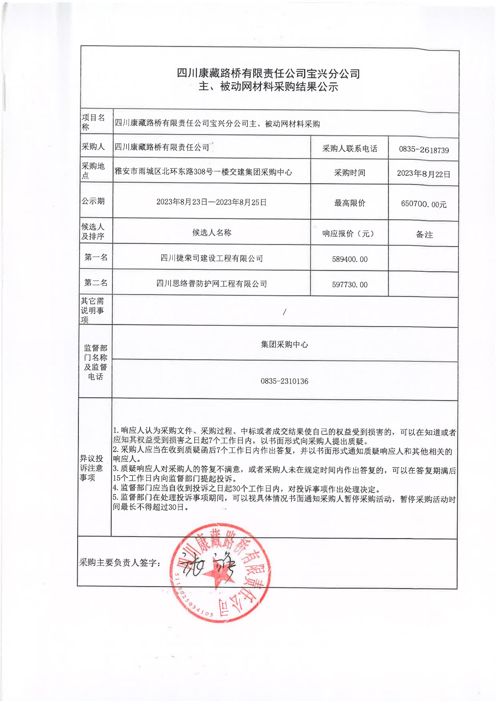 四川康藏路橋有限責(zé)任公司寶興分公司主、被動網(wǎng)材料采購結(jié)果公示