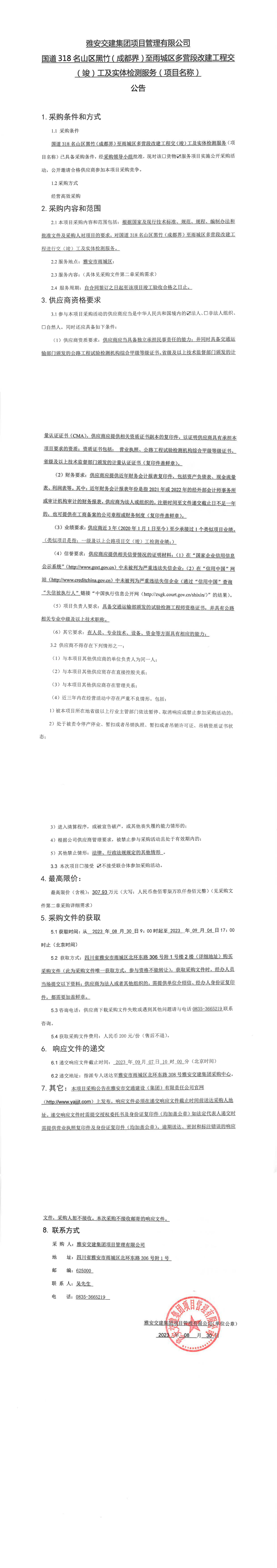 雅安交建集團(tuán)項(xiàng)目管理有限公司國(guó)道318名山區(qū)黑竹(成都界)至雨城區(qū)多營(yíng)段改建工程交(竣)工及實(shí)體檢測(cè)服務(wù)(項(xiàng)目名稱)采購(gòu)公告