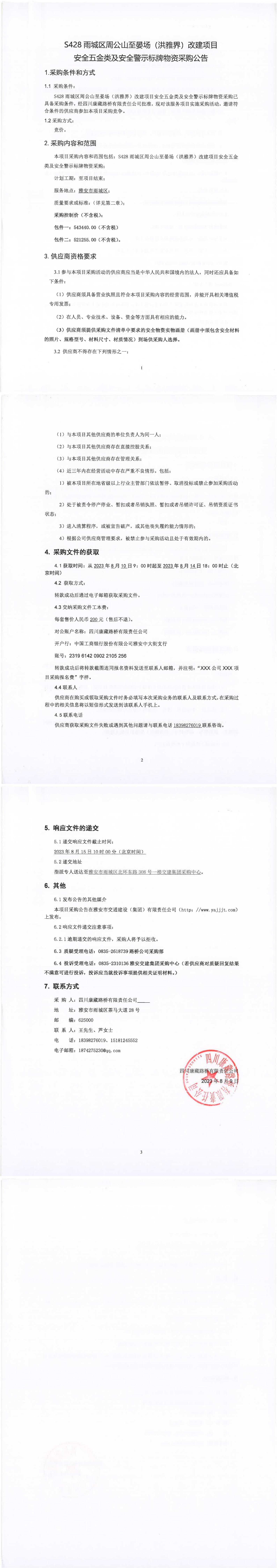 四川康藏路橋有限責(zé)任公司S428雨城區(qū)周公山至宴場(洪雅界)改建項目安全五金類及安全警示標牌物資采購公告
