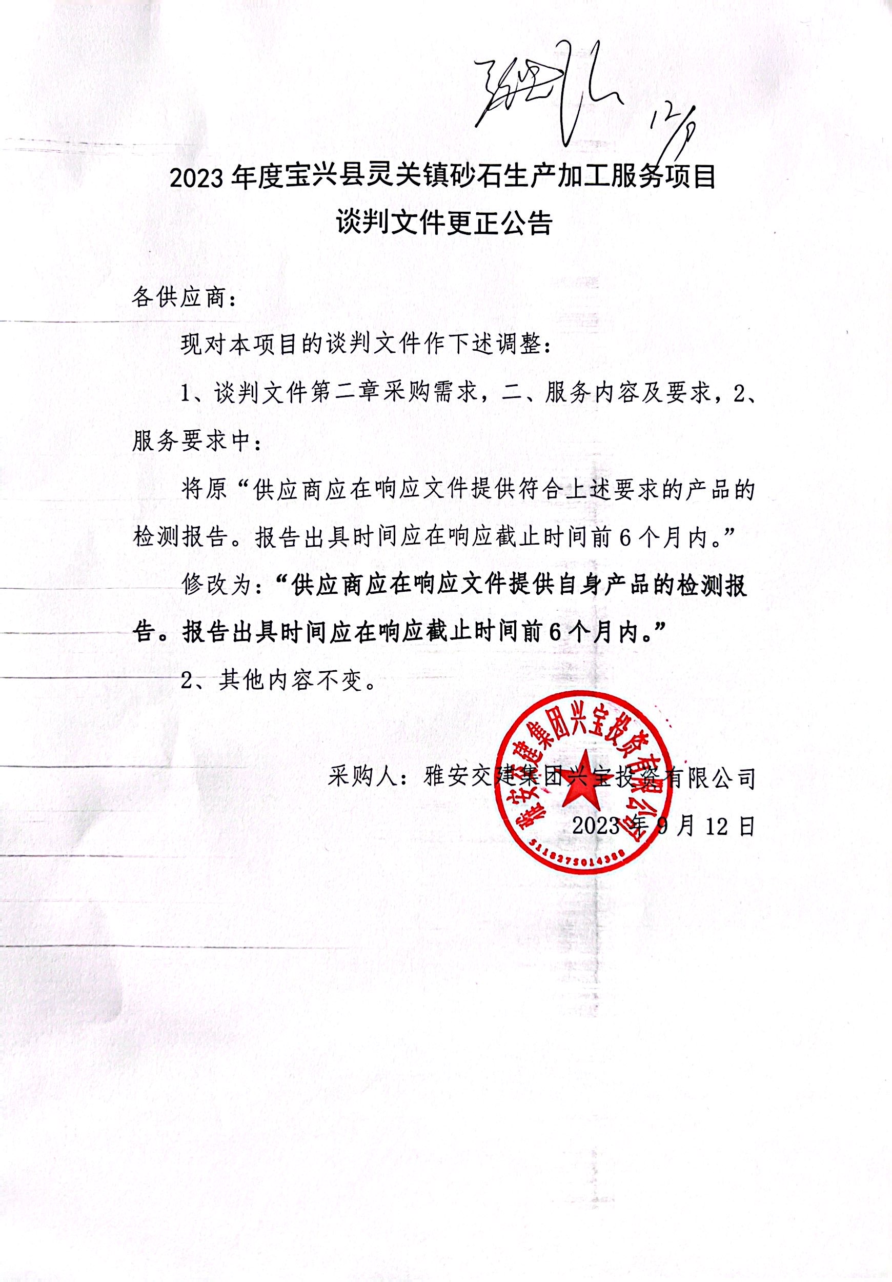 雅安交建集團興寶投資有限公司2023年度寶興縣靈關鎮(zhèn)砂石生產(chǎn)加工服務項目談判文件更正公告
