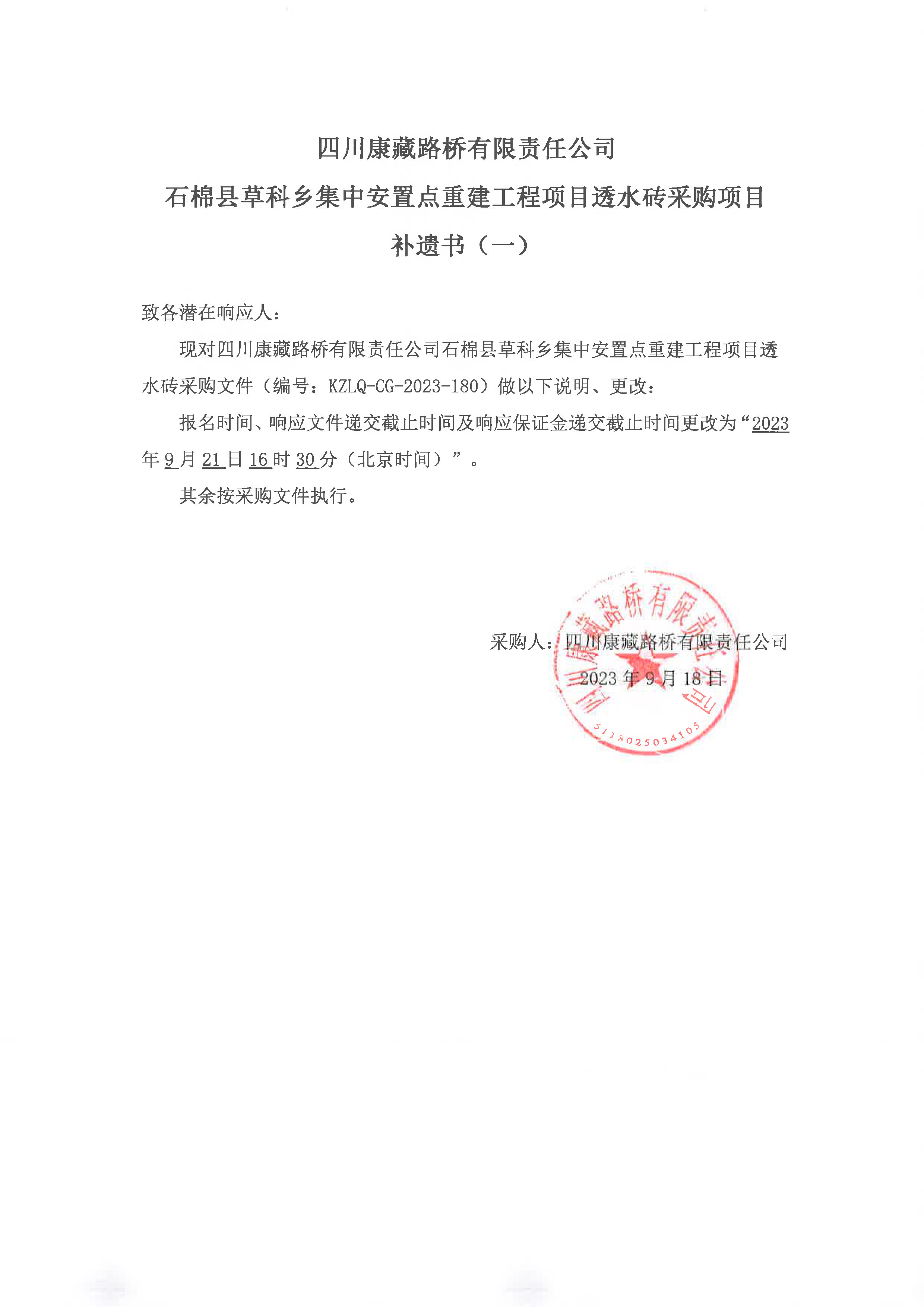四川康藏路橋有限責(zé)任公司石棉縣草科鄉(xiāng)集中安置點(diǎn)重建工程項(xiàng)目透水磚采購項(xiàng)目補(bǔ)遺書(一)