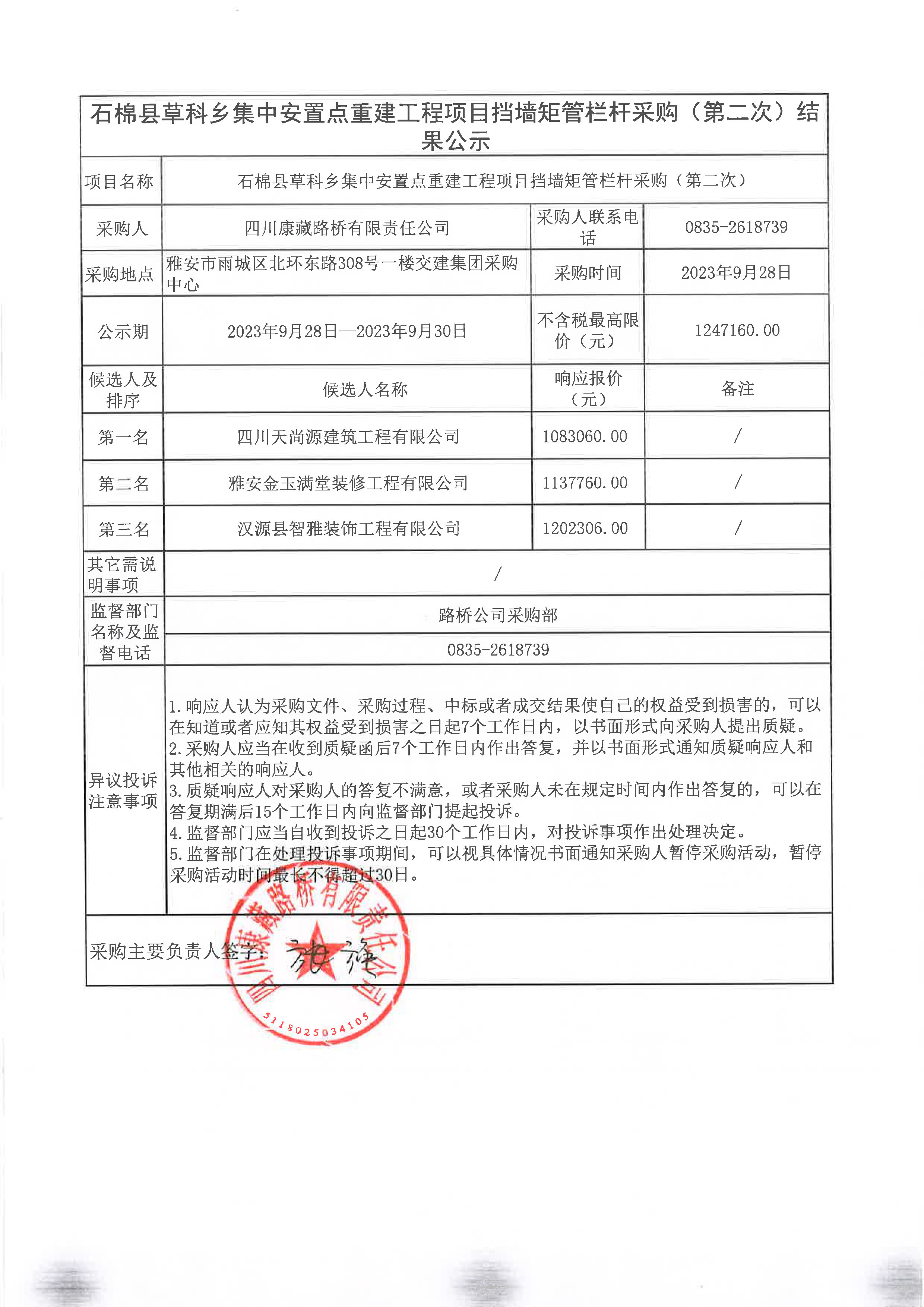 四川康藏路橋有限責(zé)任公司石棉縣草科鄉(xiāng)集中安置點(diǎn)重建工程項(xiàng)目擋墻矩管欄桿采購(第二次)結(jié)果公示