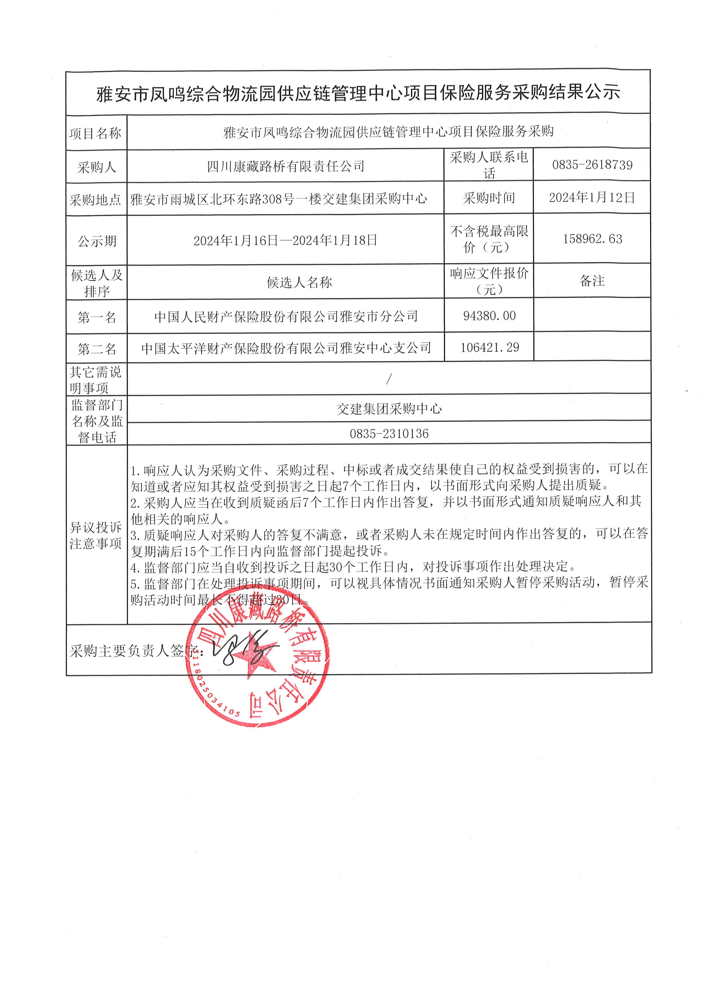 四川康藏路橋有限責(zé)任公司雅安市鳳鳴綜合物流園供應(yīng)鏈管理中心項(xiàng)目保險(xiǎn)服務(wù)采購(gòu)結(jié)果公示