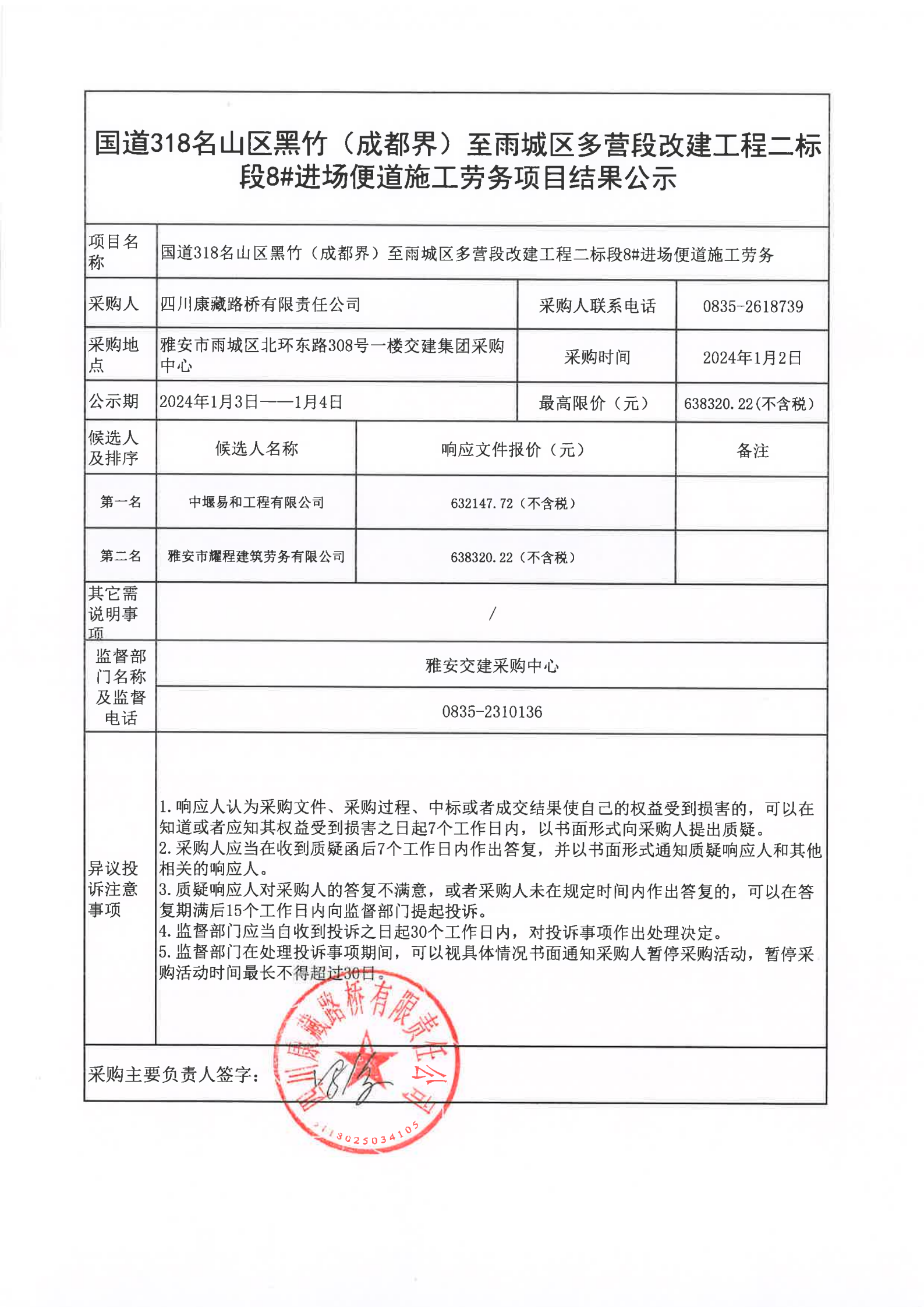 四川康藏路橋有限責任公司國道318名山區(qū)黑竹(成都界)至雨城區(qū)多營段改建工程二標段8#進場便道施工勞務(wù)項目結(jié)果公示
