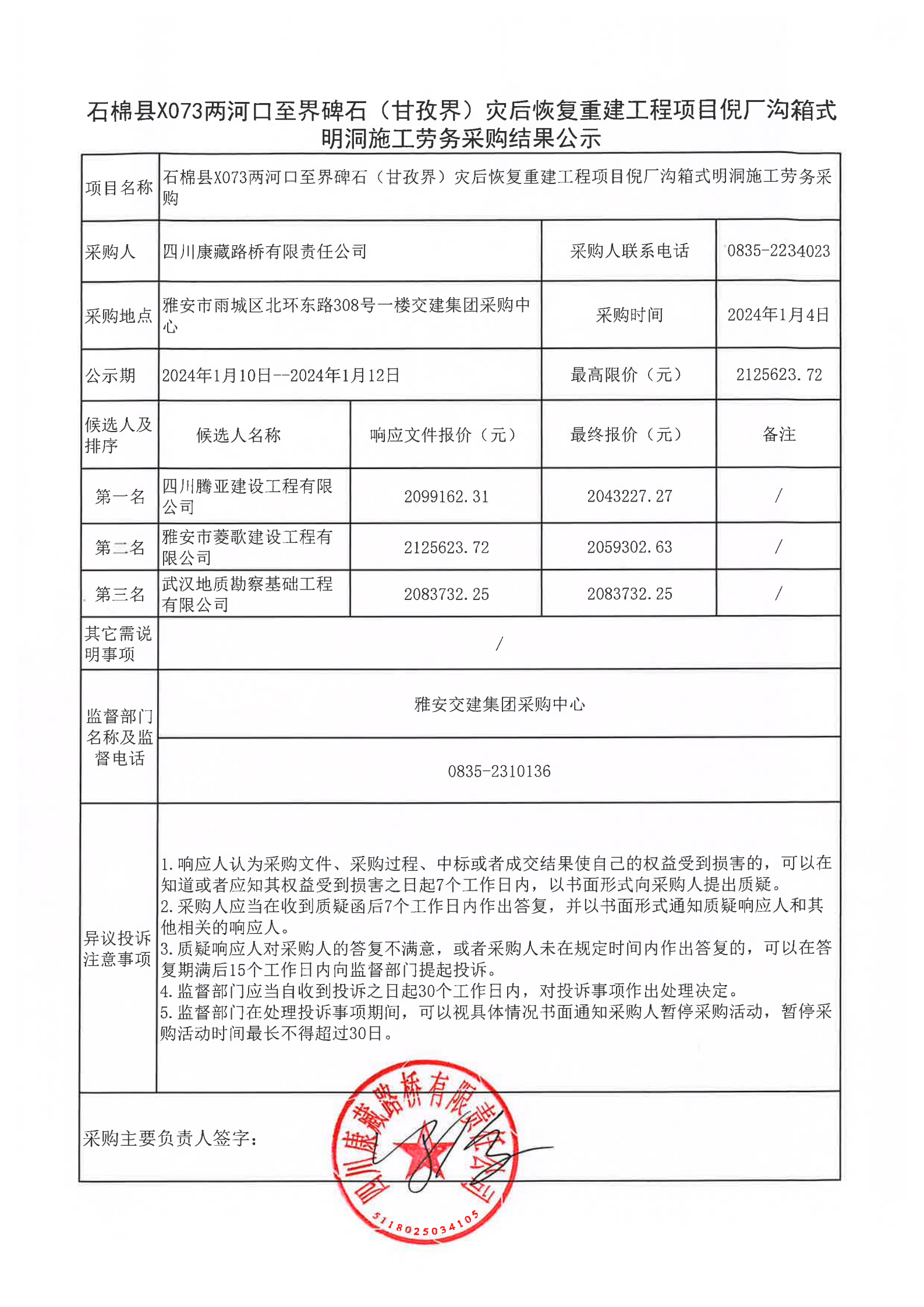 四川康藏路橋有限責任公司石棉縣X073兩河口至界碑石(甘孜界)災后恢復重建工程項目倪廠溝箱式明洞施工勞務采購結(jié)果公示