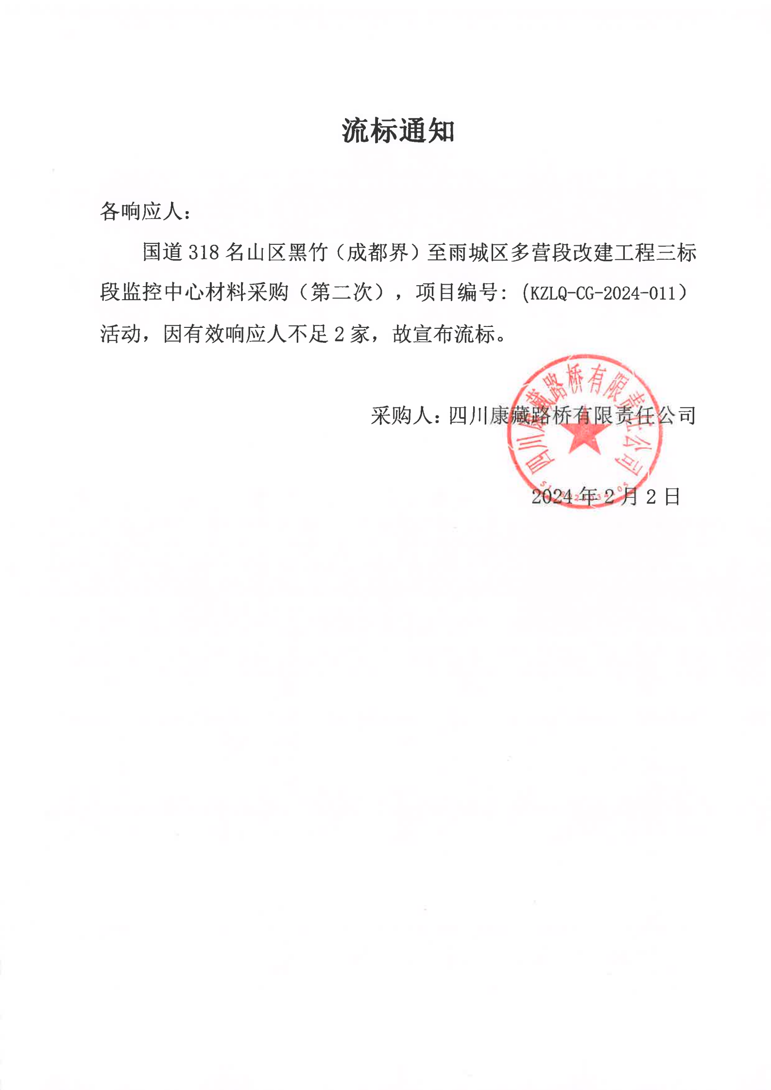 四川康藏路橋有限責任公司國道318名山區(qū)黑竹(成都界)至雨城區(qū)多營段改建工程三標段監(jiān)控中心材料采購(第二次)流標通知