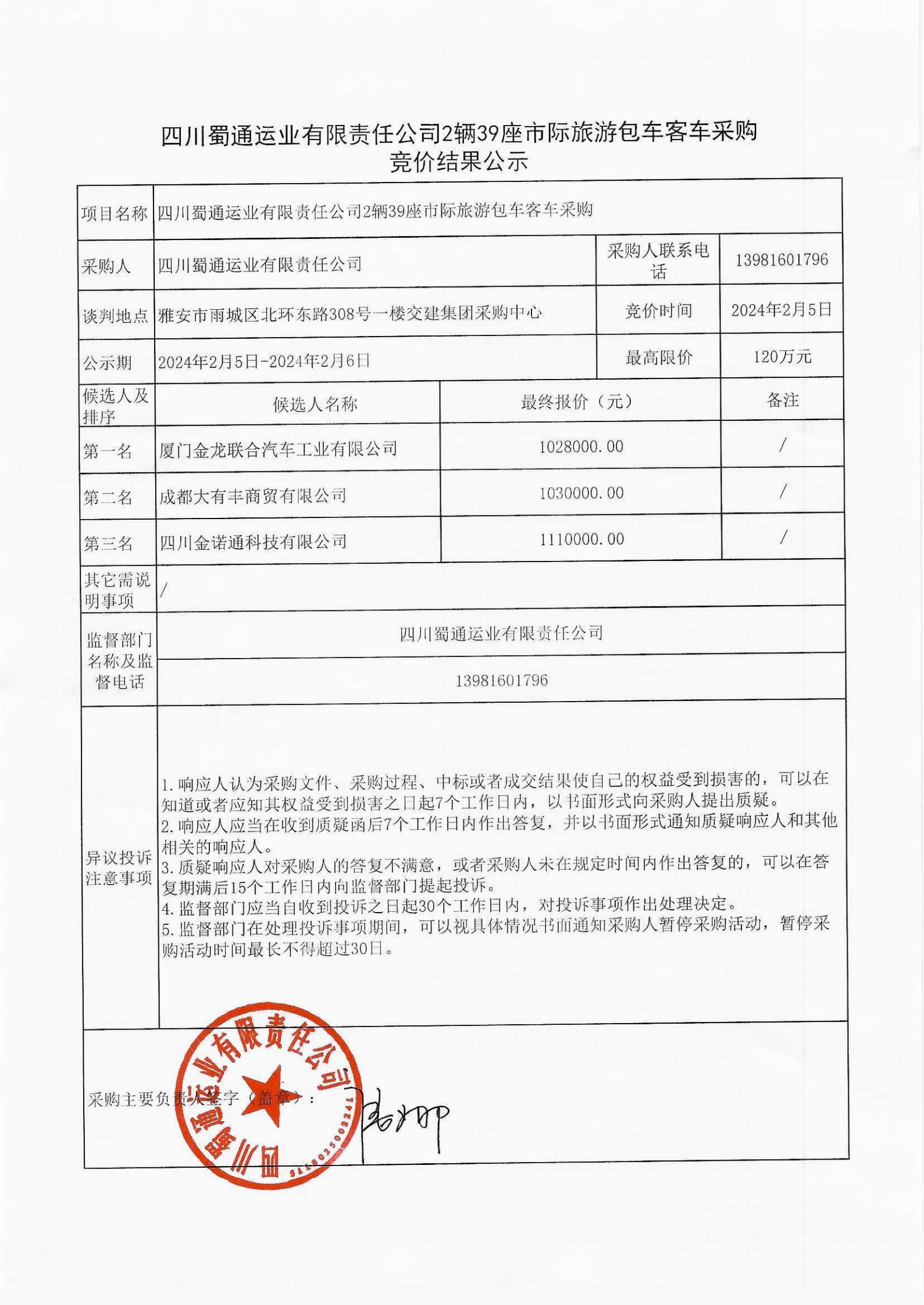 四川蜀通運(yùn)業(yè)有限責(zé)任公司2輛39座市際旅游包車客車采購競價(jià)結(jié)果公示