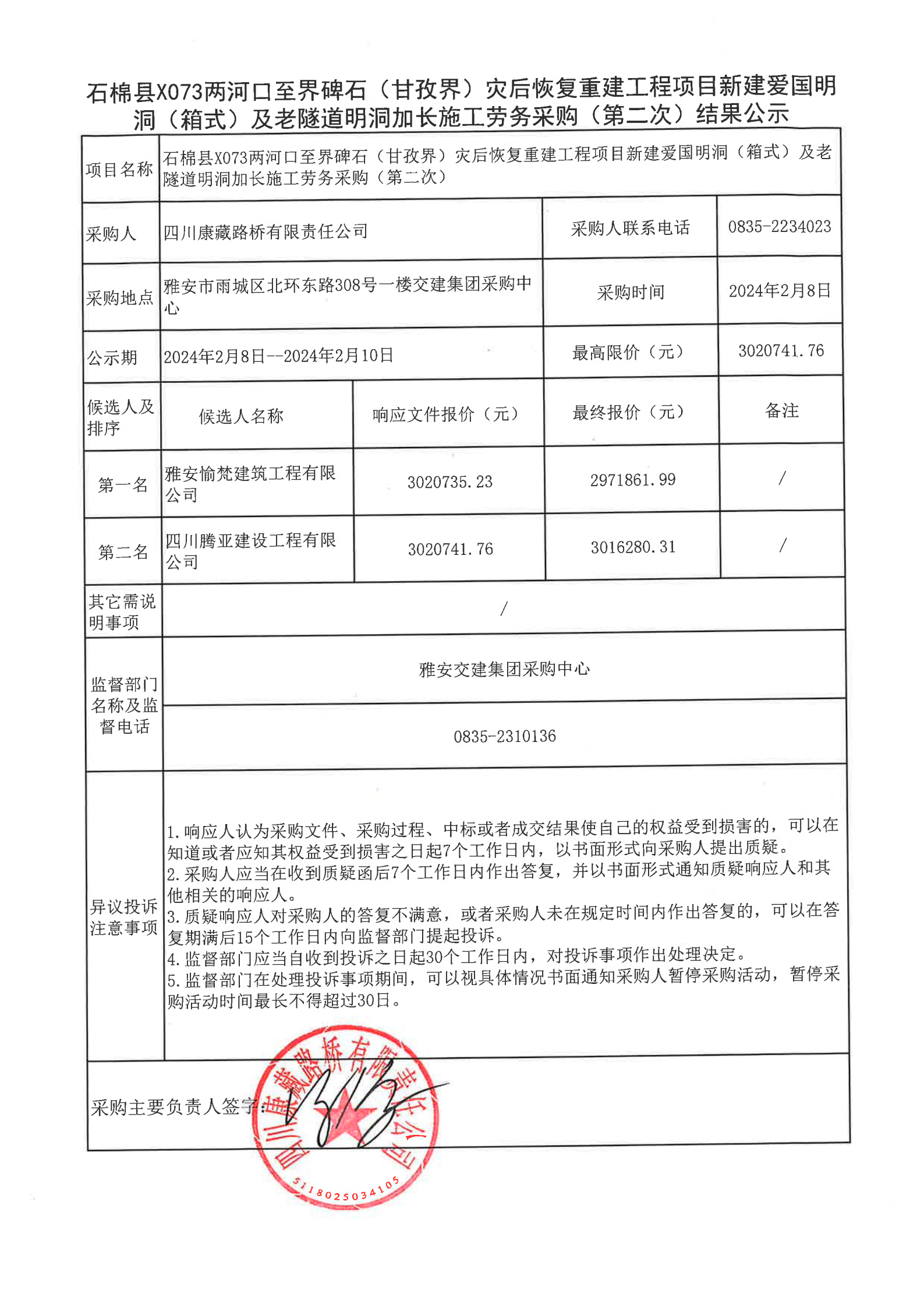 四川康藏路橋有限責任公司石棉縣X073兩河口至界碑石(甘孜界)災后恢復重建工程項目新建愛國明洞(箱式)及老隧道明洞加長施工勞務采購(第二次)結果公示