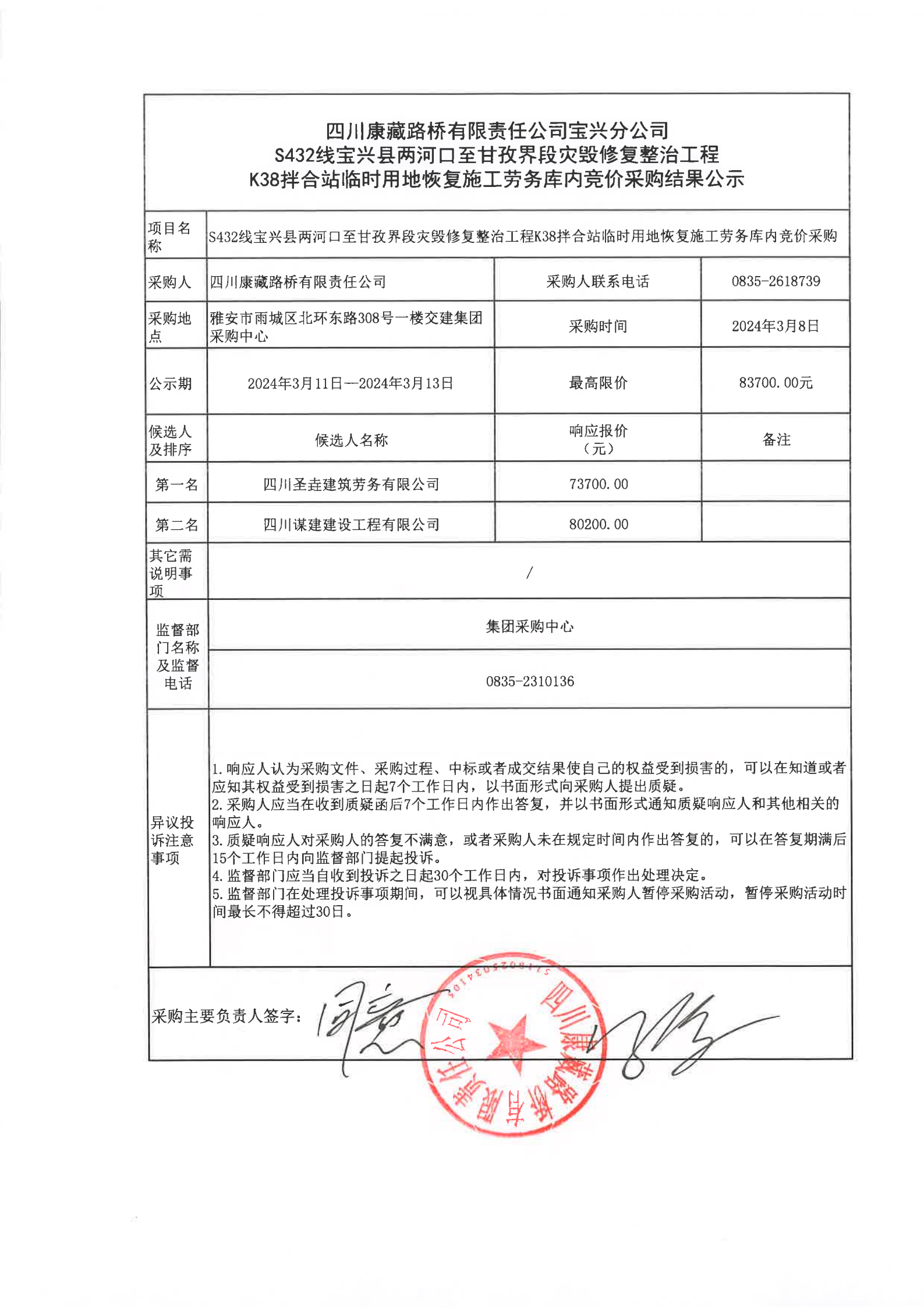 四川康藏路橋有限責(zé)任公司寶興分公司S432線寶興縣兩河口至甘孜界段災(zāi)毀修復(fù)整治工程K10棄土場(chǎng)施工勞務(wù)庫(kù)內(nèi)采購(gòu)結(jié)果公示