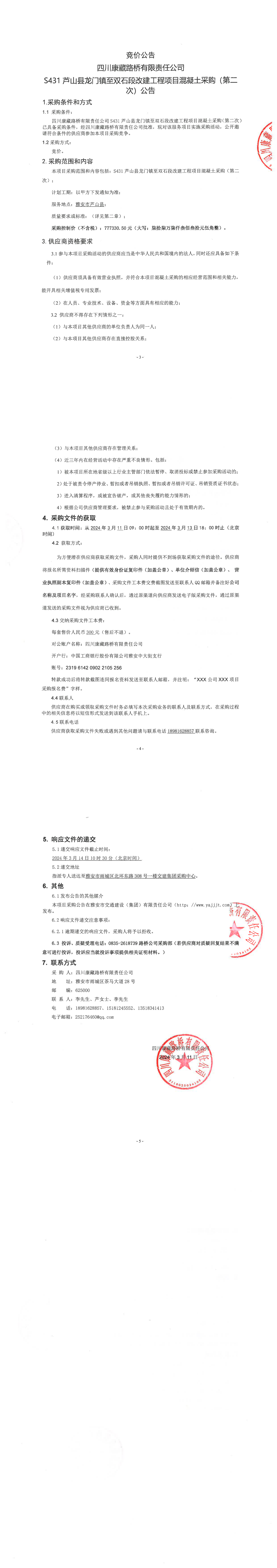 四川康藏路橋有限責(zé)任公司S431蘆山縣龍門鎮(zhèn)至雙石段改建工程項目混凝土采購(第二次)公告