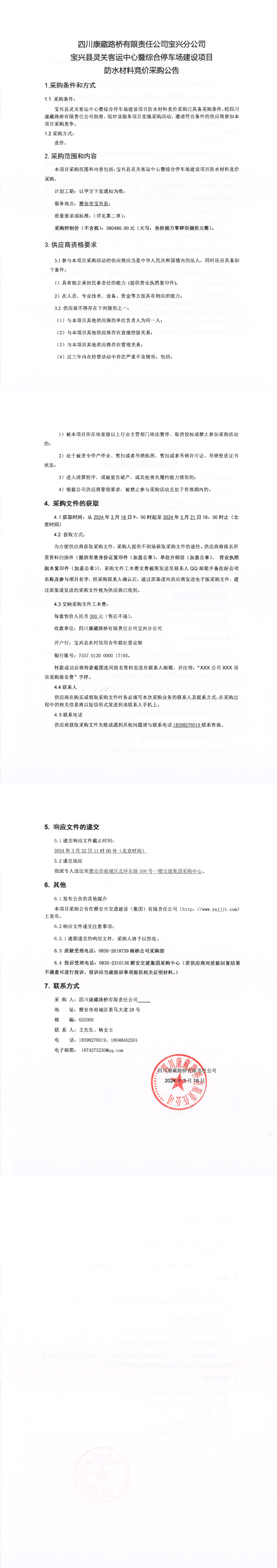 四川康藏路橋有限責任公司寶興縣靈關(guān)客運中心暨綜合停車場建設項目防水材料競價采購公告