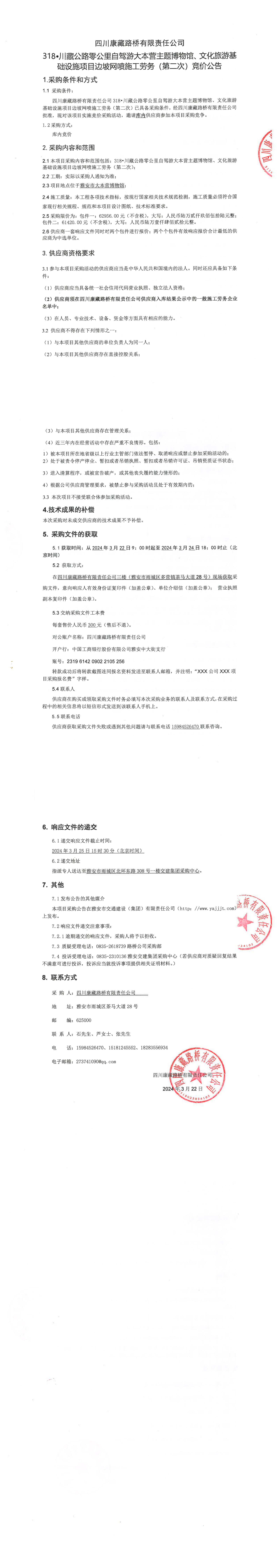 四川康藏路橋有限責任公司318·川藏公路零公里自駕游大本營主題博物館、文化旅游基礎(chǔ)設(shè)施項目邊坡網(wǎng)噴施工勞務(wù)(第二次)競價公告