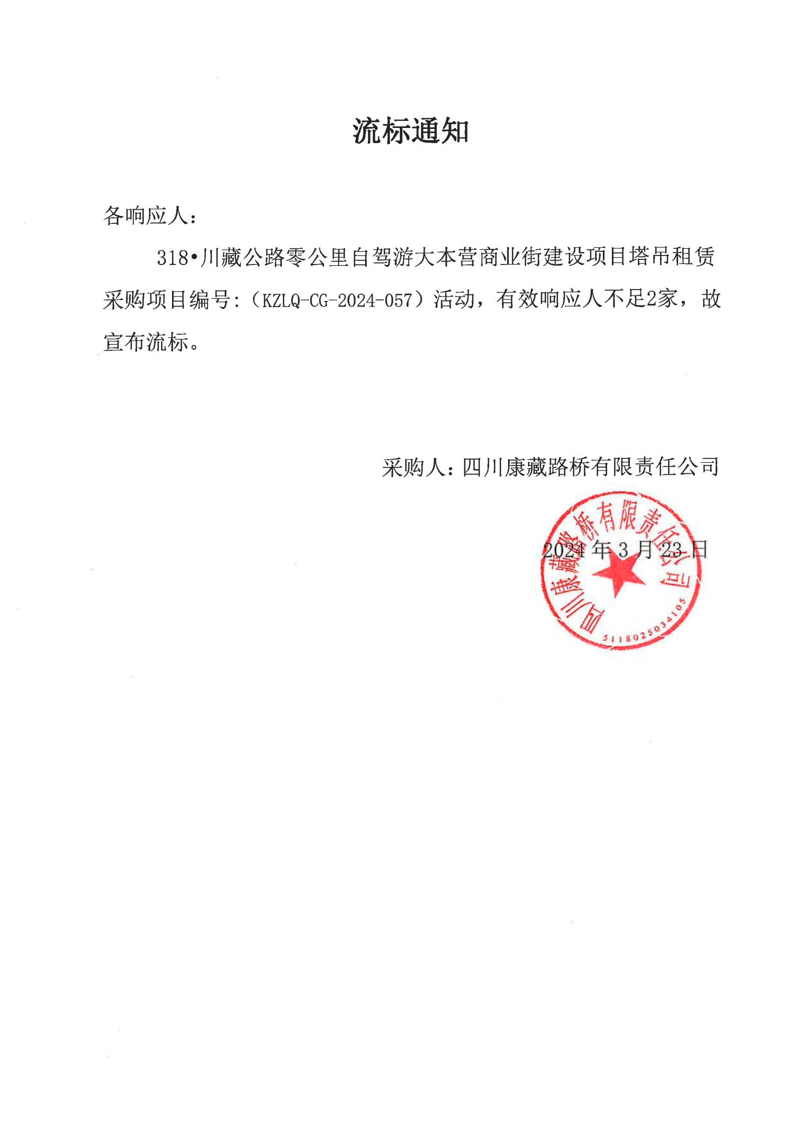 四川康藏路橋有限責任公司318•川藏公路零公里自駕游大本營商業(yè)街建設(shè)項目塔吊租賃采購流標通知
