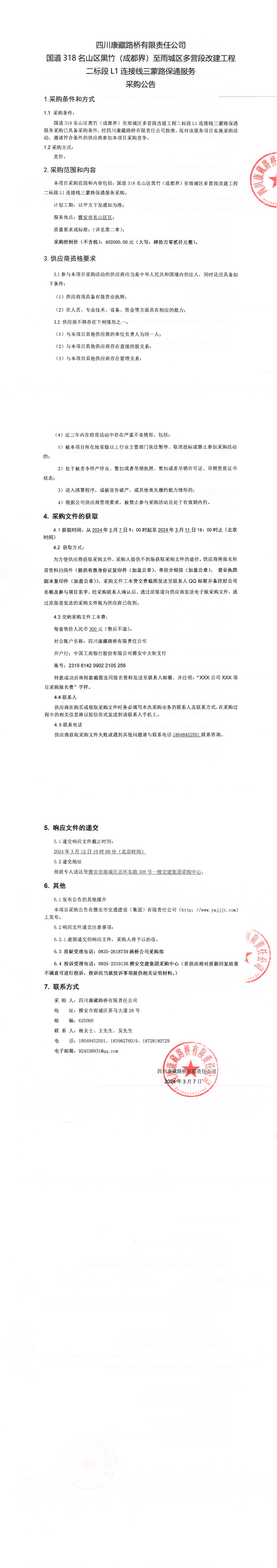 四川康藏路橋有限責(zé)任公司國道318名山區(qū)黑竹(成都界)至雨城區(qū)多營段改建工程二標(biāo)段L1連接線三蒙路保通服務(wù)采購公告