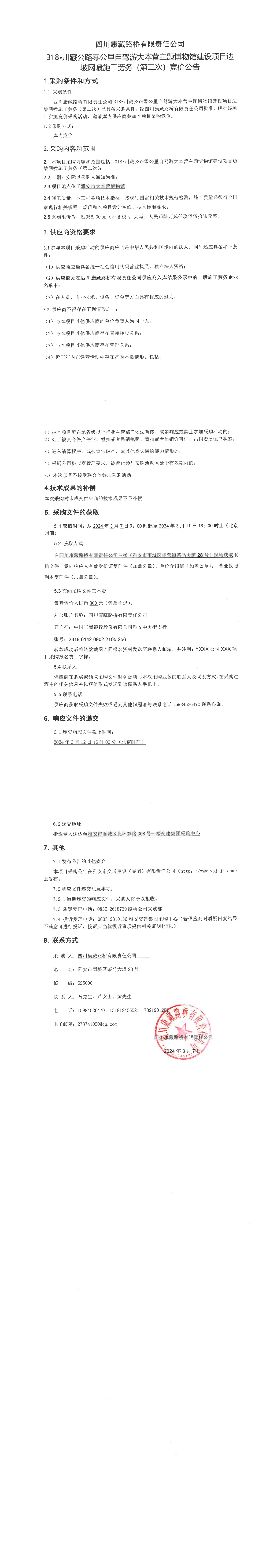 四川康藏路橋有限責任公司318·川藏公路零公里自駕游大本營主題博物館建設項目邊坡網(wǎng)噴施工勞務(第二次)競價公告