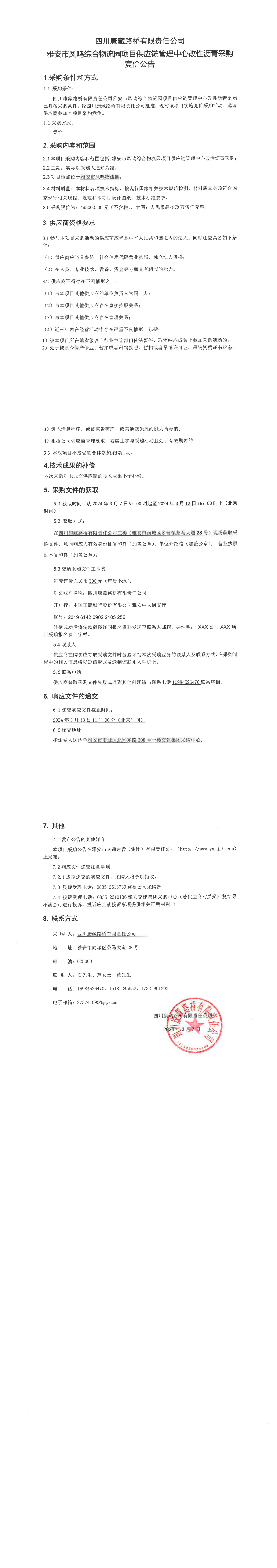 四川康藏路橋有限責(zé)任公司雅安市鳳鳴綜合物流園項目供應(yīng)鏈管理中心改性瀝青采購競價公告