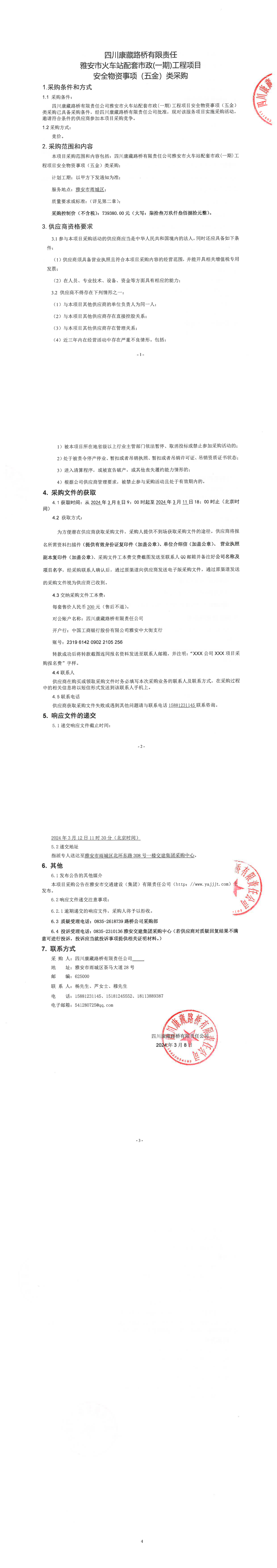 四川康藏路橋有限責(zé)任公司雅安市火車站配套市政(一期)工程項目安全物資事項(五金)類采購公告