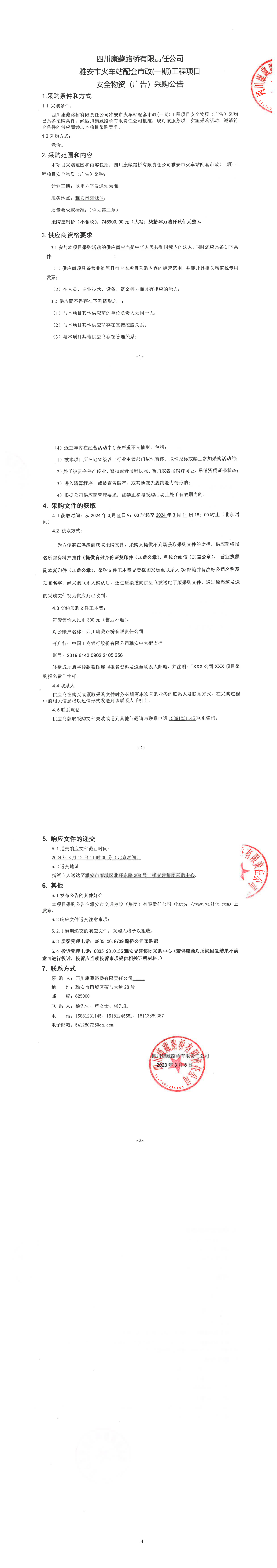 四川康藏路橋有限責(zé)任公司雅安市火車站配套市政(一期)工程項(xiàng)目安全物質(zhì)(廣告)采購公告