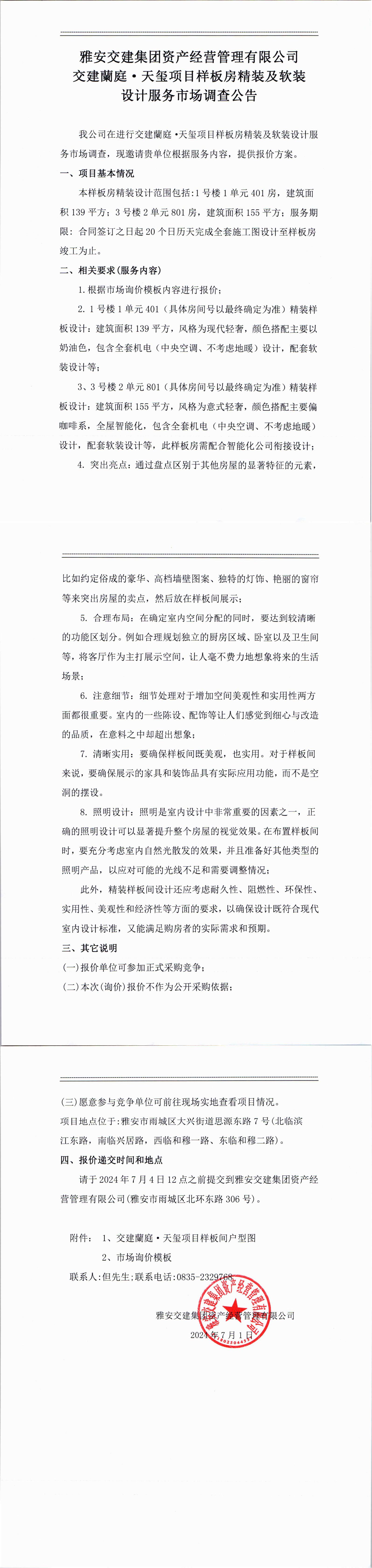雅安交建集團資產經營管理有限公司交建蘭庭·天璽項目樣板房精裝及軟裝設計服務市場調查公告