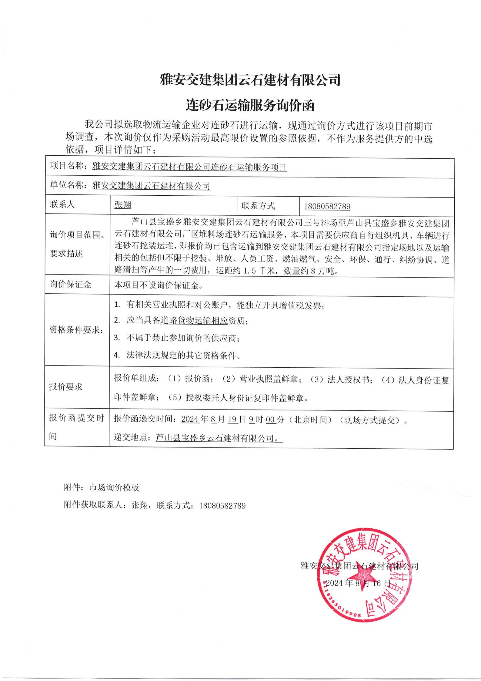 雅安交建集團云石建材有限公司連砂石運輸服務詢價函