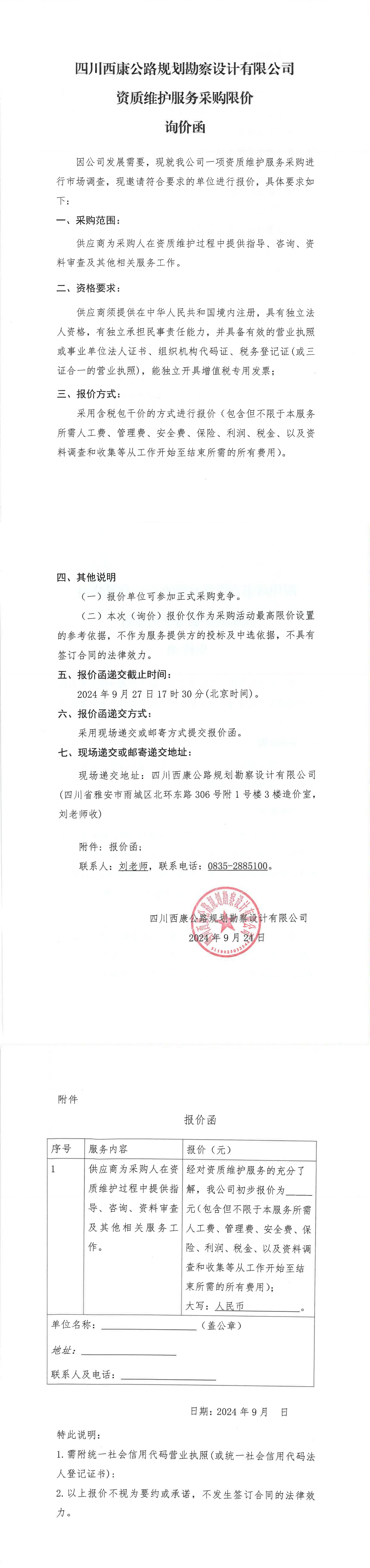 四川西康公路規(guī)劃勘察設計有限公司資質(zhì)維護服務采購限價詢價函