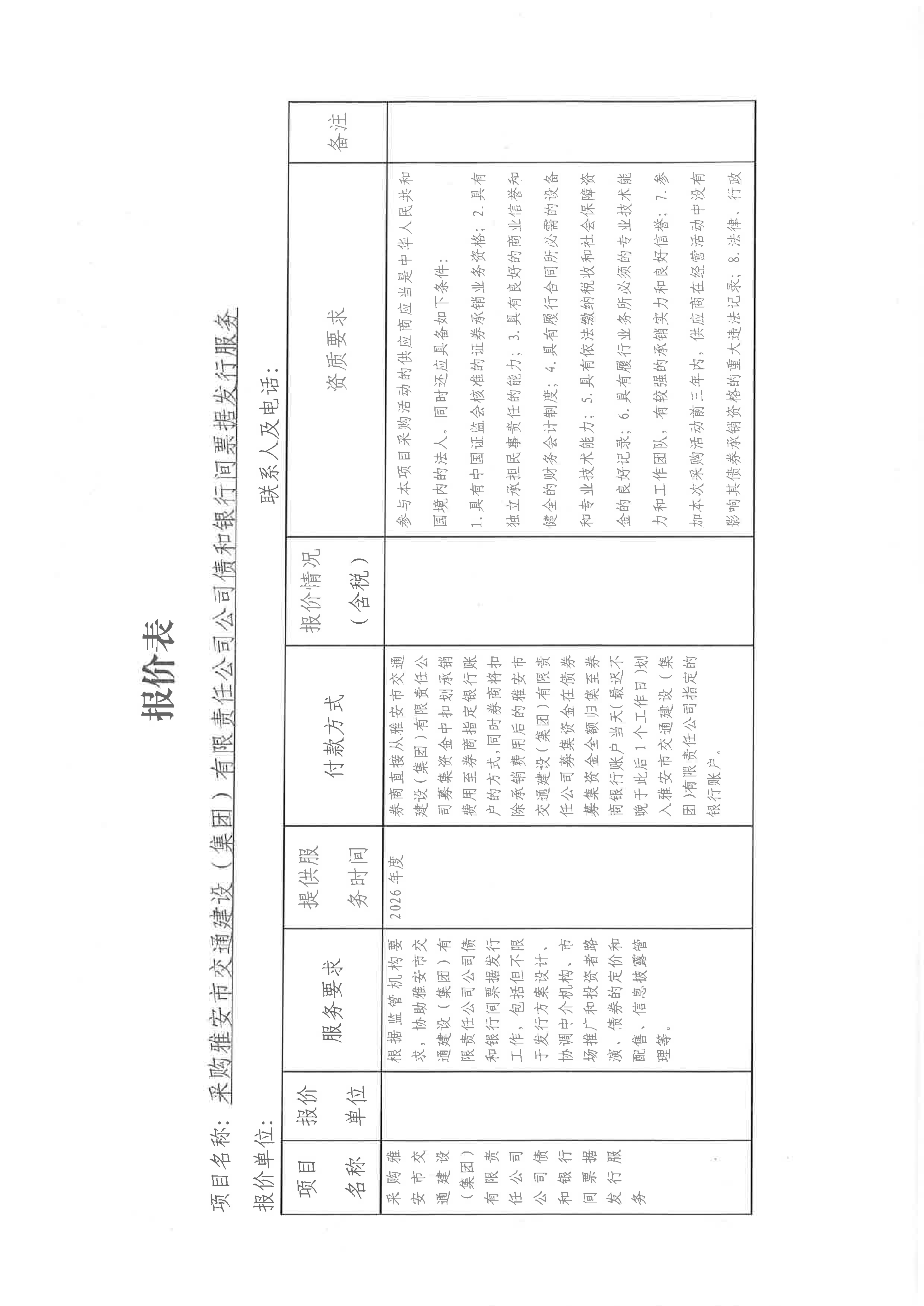關(guān)于采購(gòu)雅安市交通建設(shè)(集團(tuán))有限責(zé)任公司發(fā)行公司債和發(fā)行銀行間票據(jù)所需券商服務(wù)限價(jià)的詢價(jià)函