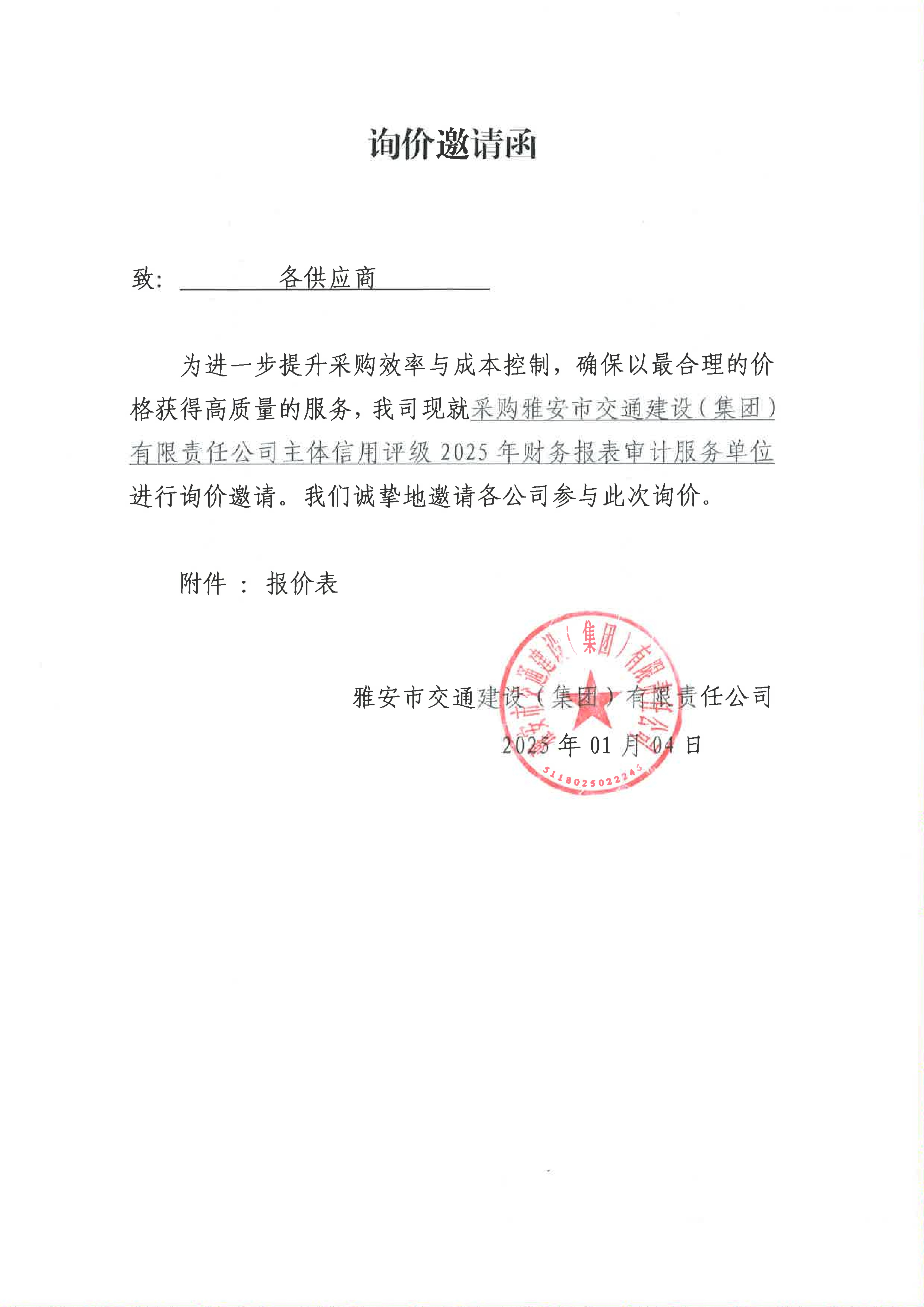 關(guān)于采購(gòu)雅安市交通建設(shè)(集團(tuán))有限責(zé)任公司主體信用評(píng)級(jí)2025年財(cái)務(wù)報(bào)表審計(jì)服務(wù)限價(jià)的詢價(jià)函