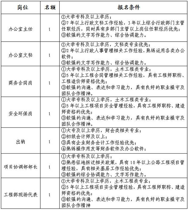 雅安交建集團資產(chǎn)經(jīng)營管理有限公司是雅安市重點國有企業(yè)雅安市交建集團下屬子公司,主要從事企業(yè)資產(chǎn)經(jīng)營管理;項目投資;土地整理等業(yè)務。根據(jù)公司發(fā)展需要,決定面向社會公開招聘7名工作人員,現(xiàn)將有關事項公告如下:
