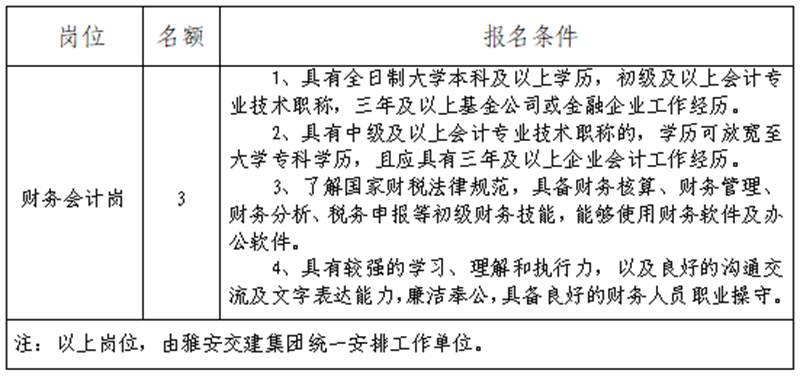 根據(jù)發(fā)展需要,決定面向社會公開招聘雅安市交通建設(集團)有限責任公司(以下簡稱“雅安交建集團”)所屬子公司財務工作人員3名,現(xiàn)將有關事項公告如下: