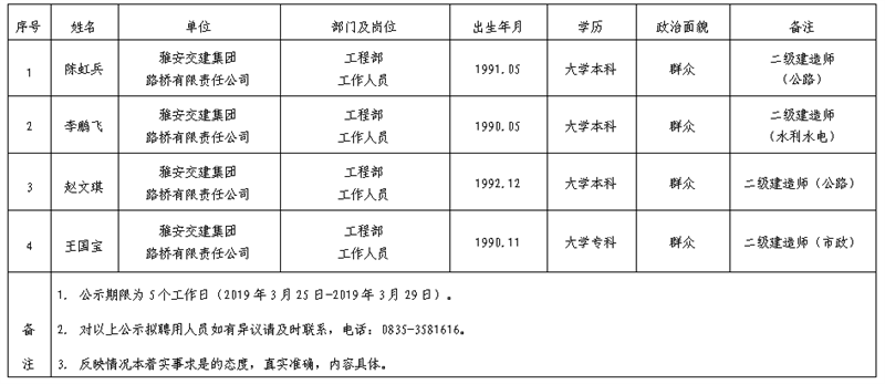 雅安交建集團(tuán)子公司擬聘用人員公示(路橋公司)