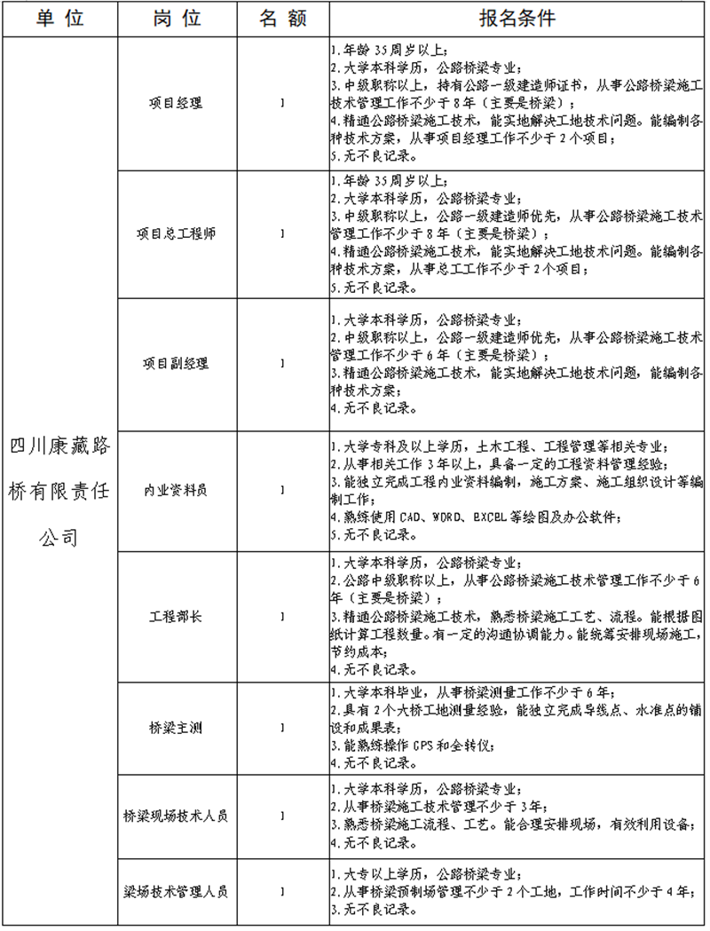 根據(jù)公司業(yè)務(wù)發(fā)展需要,決定面向社會(huì)公開(kāi)招聘省道104線草壩至姚橋段改建項(xiàng)目部專(zhuān)業(yè)技術(shù)人才8名,現(xiàn)將有關(guān)事項(xiàng)公告如下: