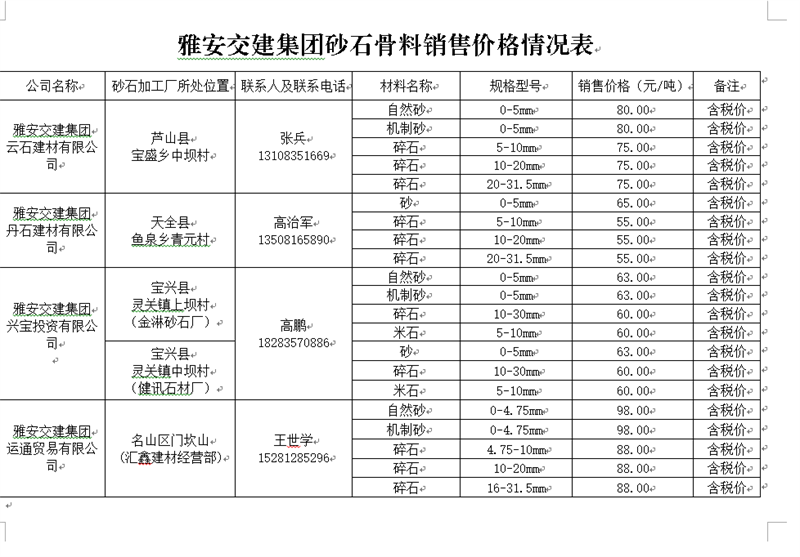 四、運(yùn)通貿(mào)易有限公司。運(yùn)通公司是雅安市交通建設(shè)(集團(tuán))有限責(zé)任公司獨(dú)資子公司,主要負(fù)責(zé)雨城區(qū)中心城區(qū)河道外砂石經(jīng)營(yíng)管理工作。目前,公司與兩家企業(yè)確定了代加工合作關(guān)系:一是名山區(qū)匯鑫建材經(jīng)營(yíng)部,該企業(yè)位于名山區(qū)門(mén)坎山,已投產(chǎn);二是雅安市名山區(qū)雙飛化工商貿(mào)有限公司該公司位于名山區(qū)馬鞍山,已具備生產(chǎn)加工能力;預(yù)計(jì)年生產(chǎn)能力約80萬(wàn)噸。
